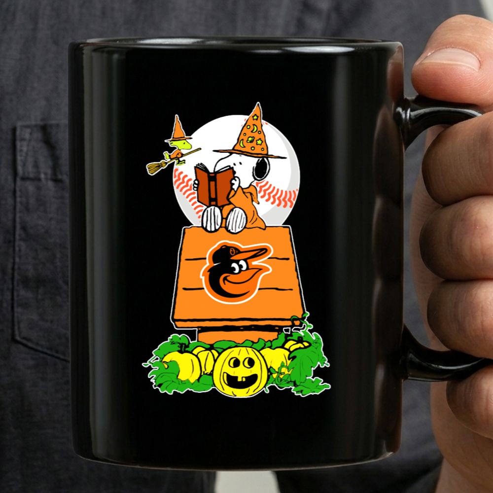 Baltimore Orioles Halloween Snoopy Reading On Doghouse With Woodstock And Pumpkins Mug