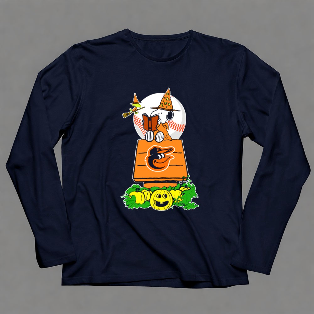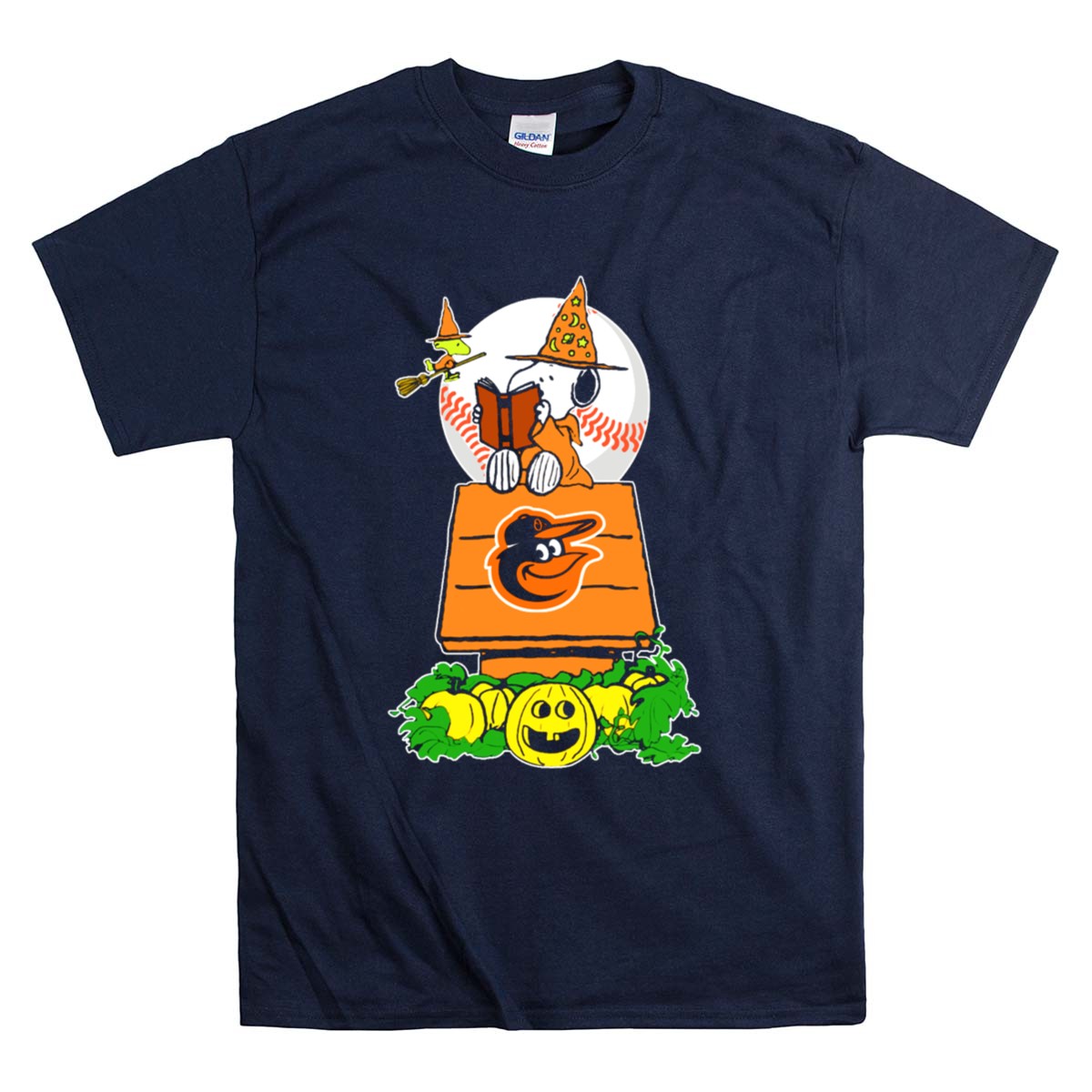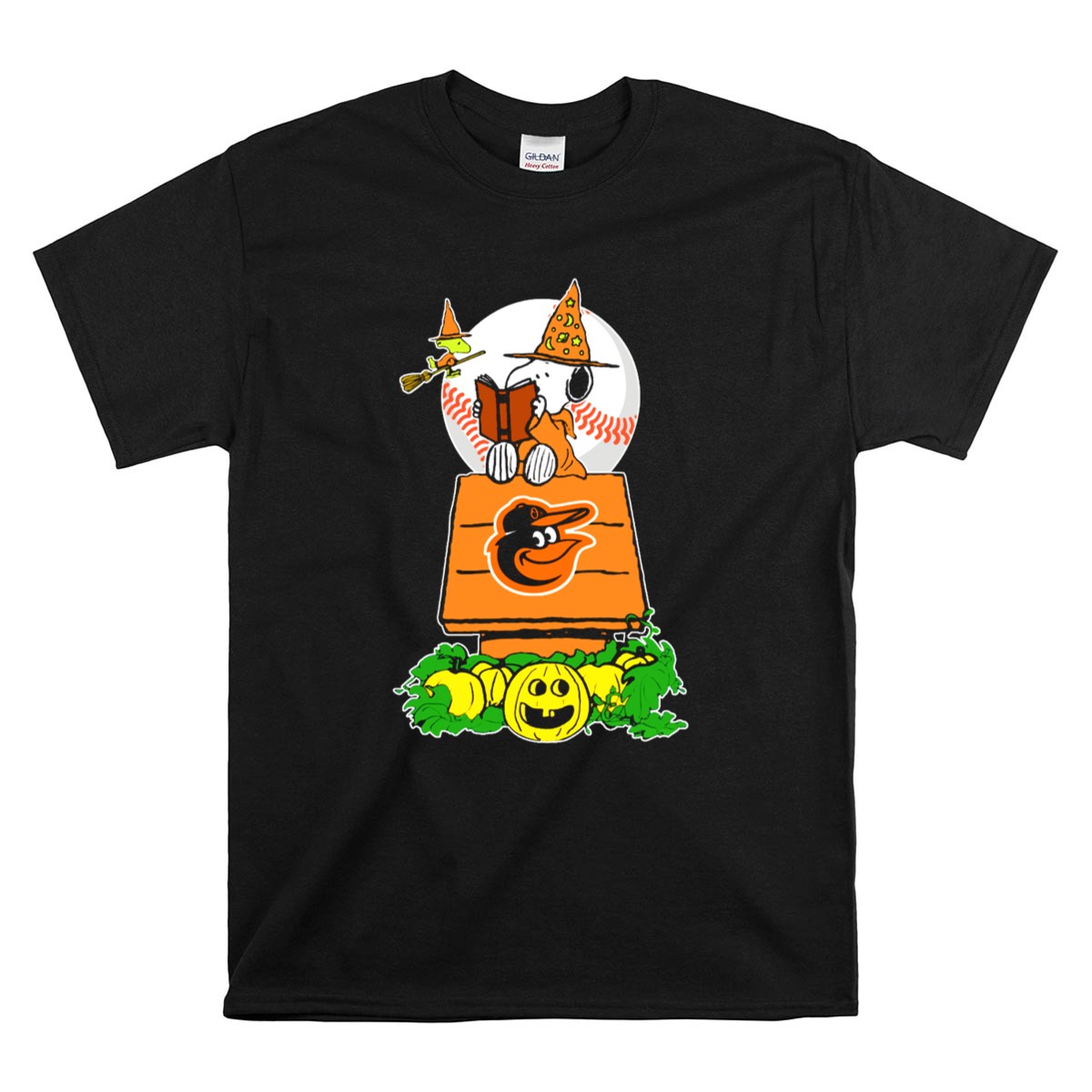 Baltimore Orioles Halloween Snoopy Reading On Doghouse With Woodstock And Pumpkins Shirt