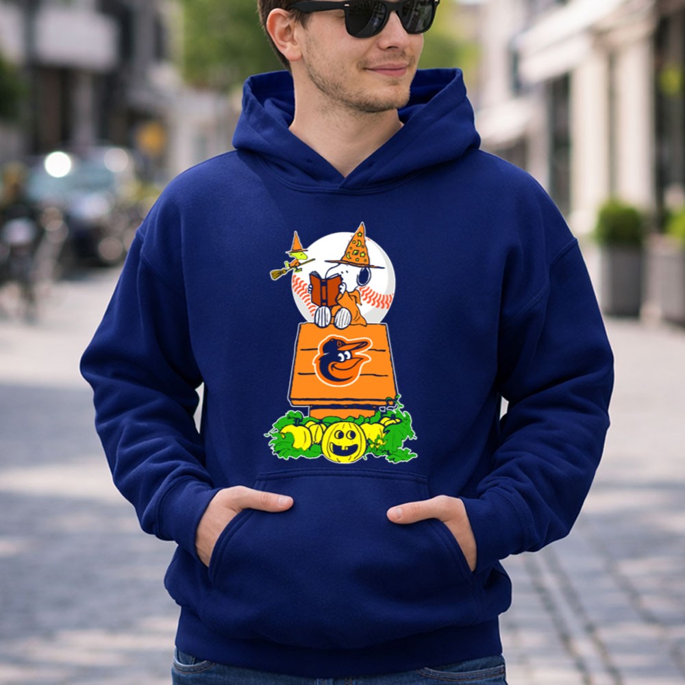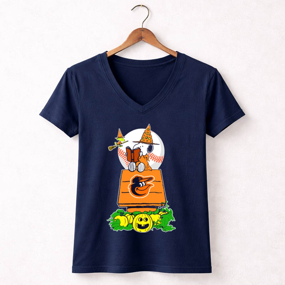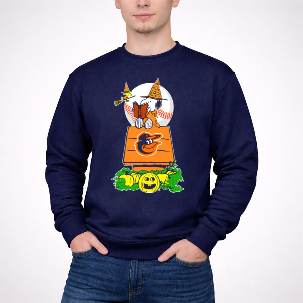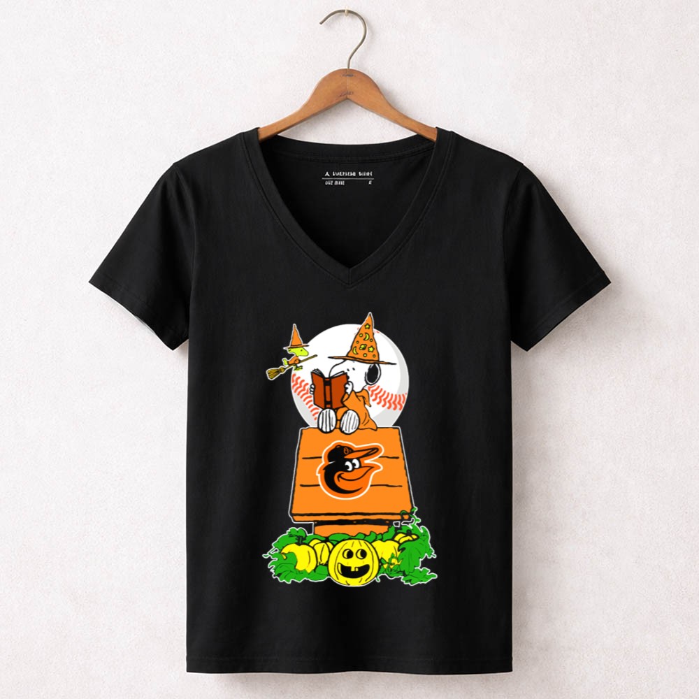 Baltimore Orioles Halloween Snoopy Reading On Doghouse With Woodstock And Pumpkins Shirt