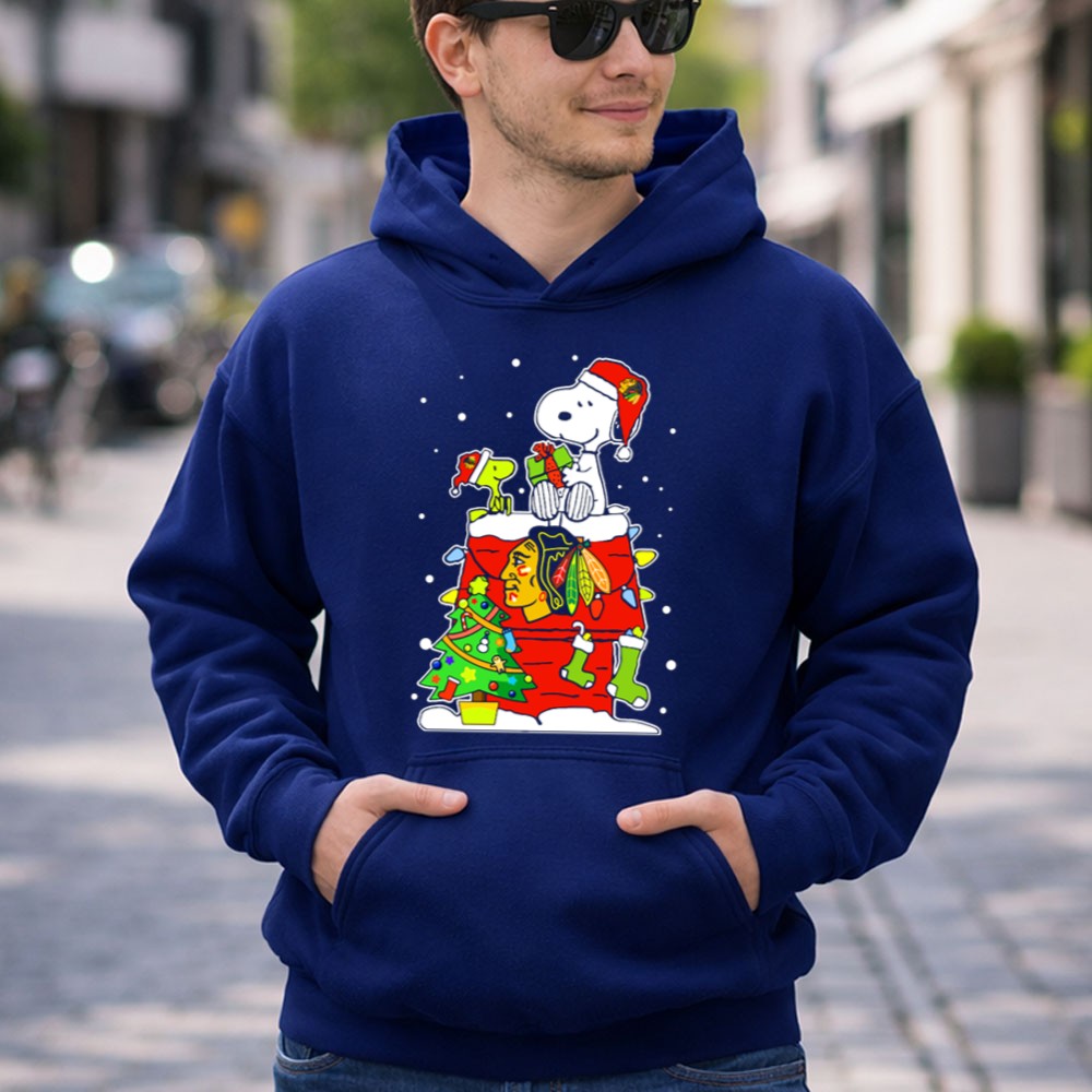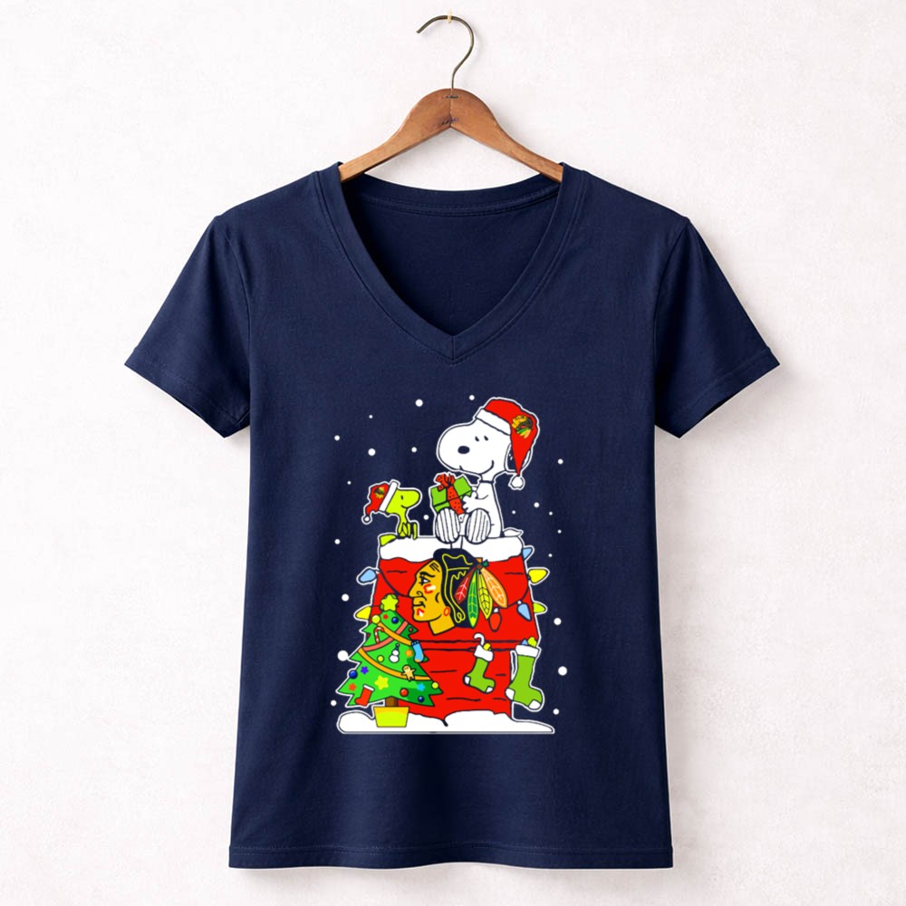 Chicago Blackhawks Snoopy Christmas With Woodstock And Santa Hat Scene Shirt