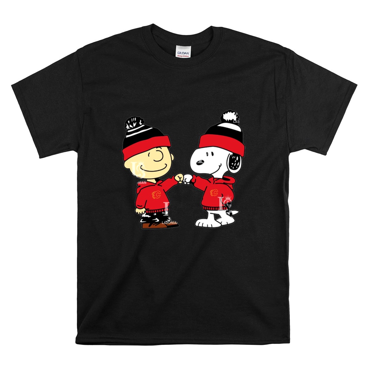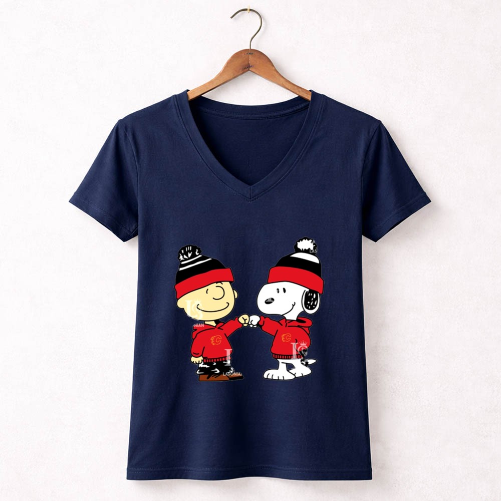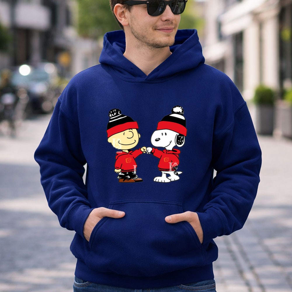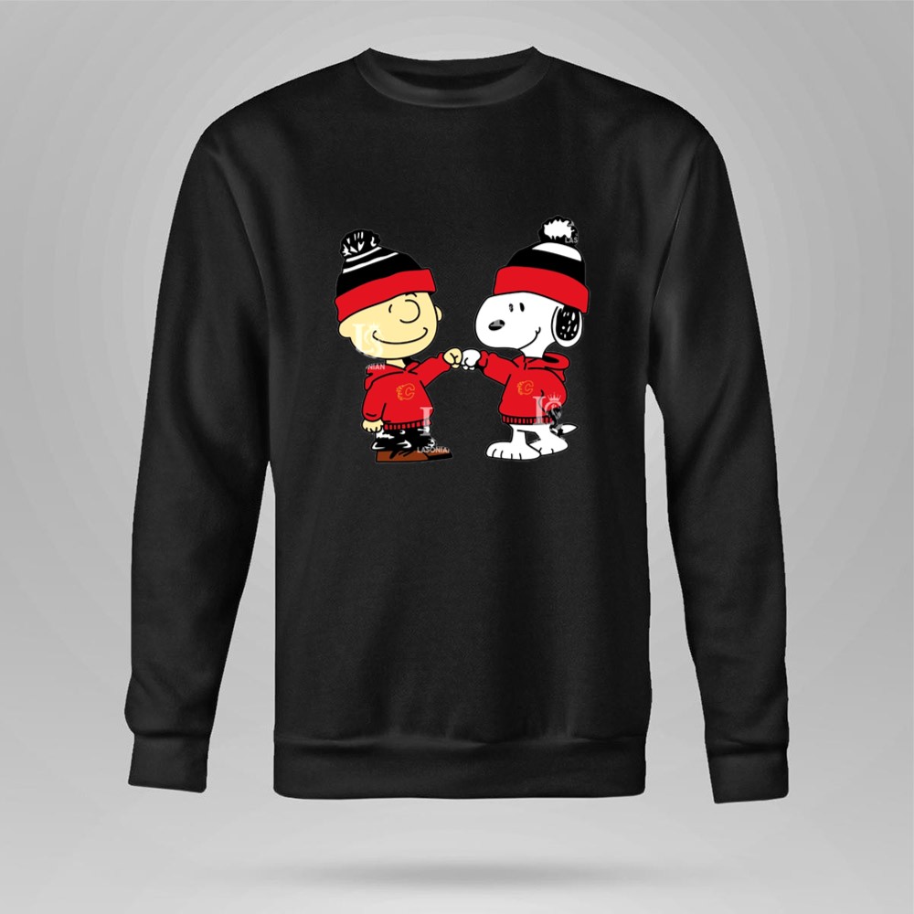 Fist Bump Charlie Brown and Snoopy Wear Clothing Calgary Flames Shirt