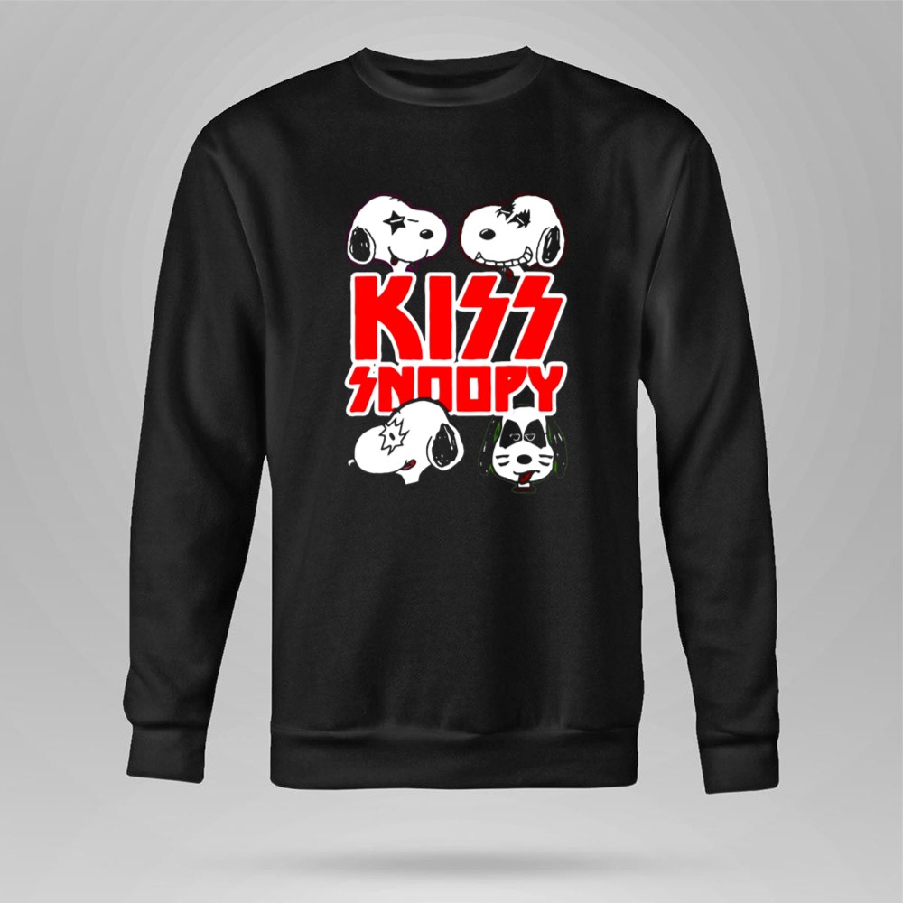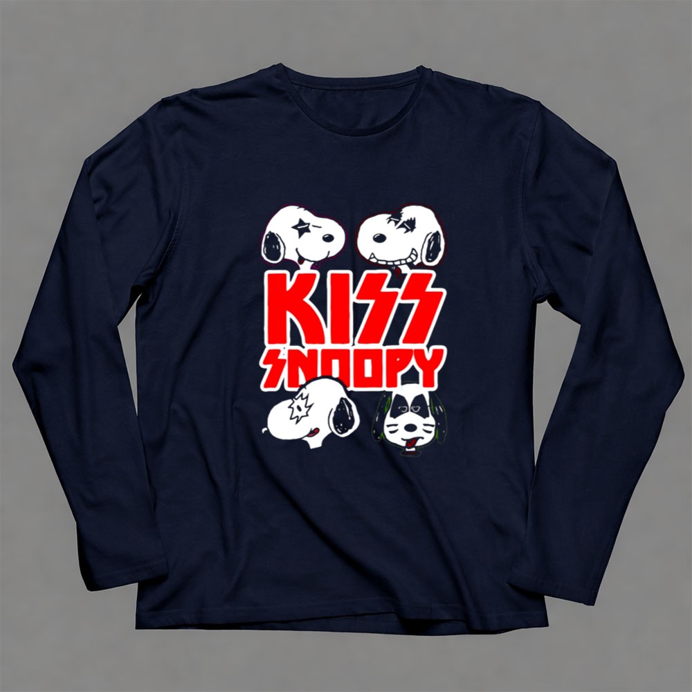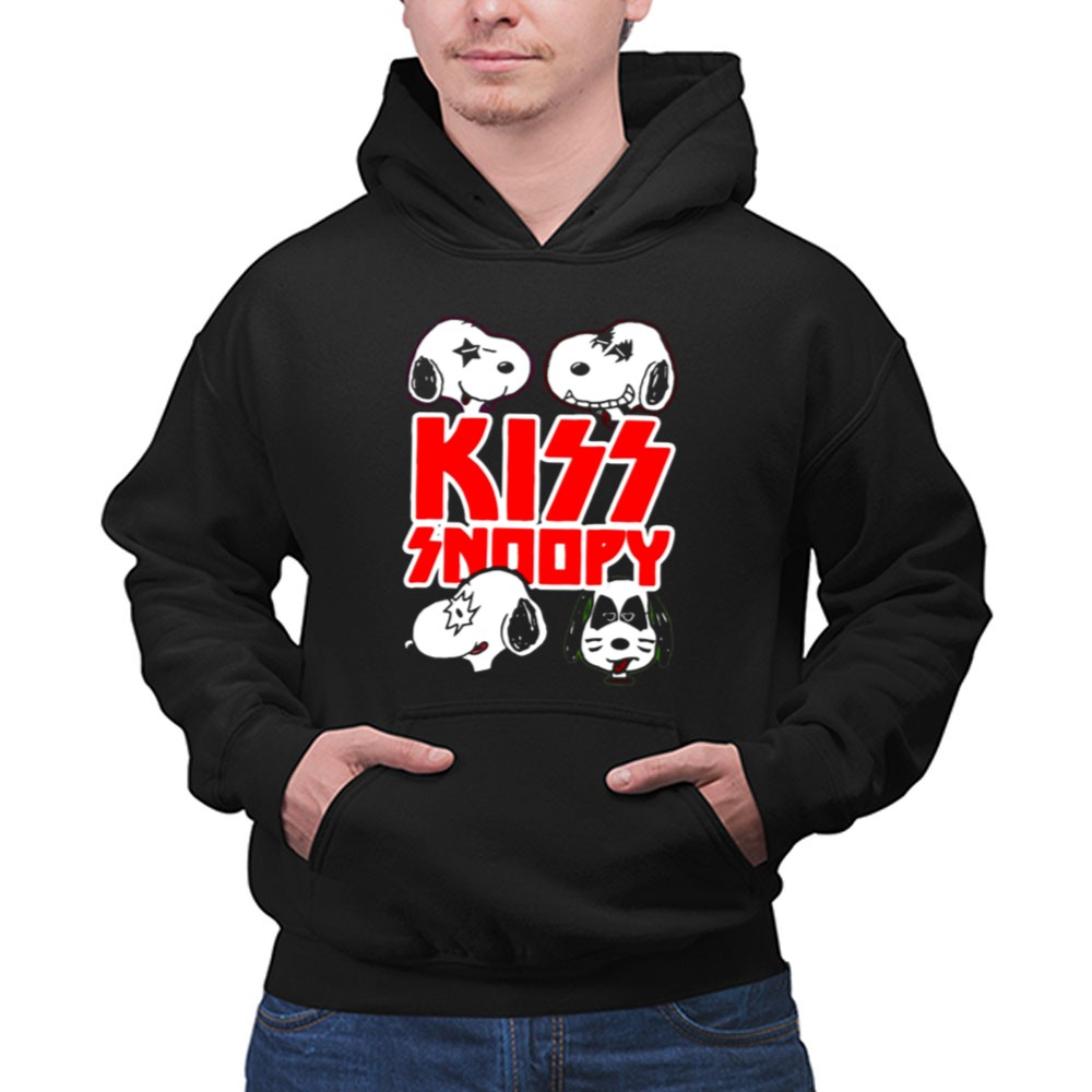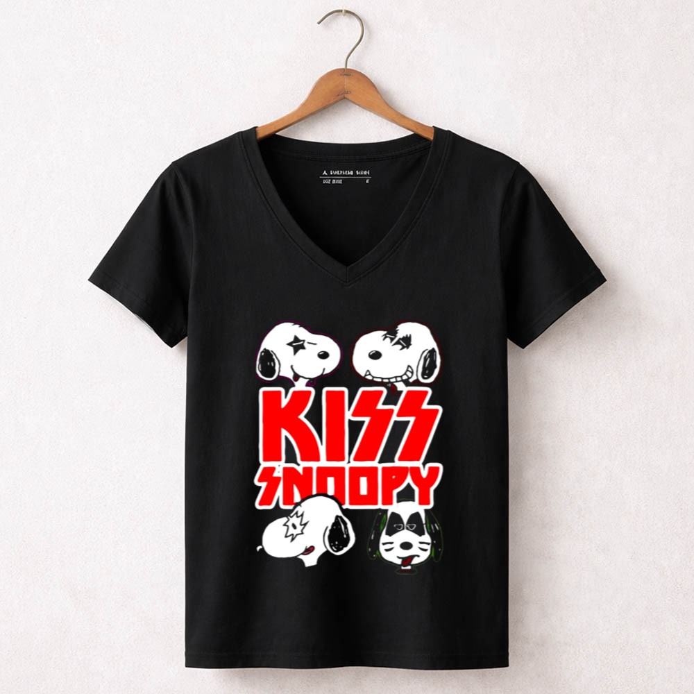 KISS band apparel, Snoopy rock mashup, Peanuts characters, fun graphic tee, nostalgic music tribute, unique gift for fans, playful cartoon design, iconic rock legends