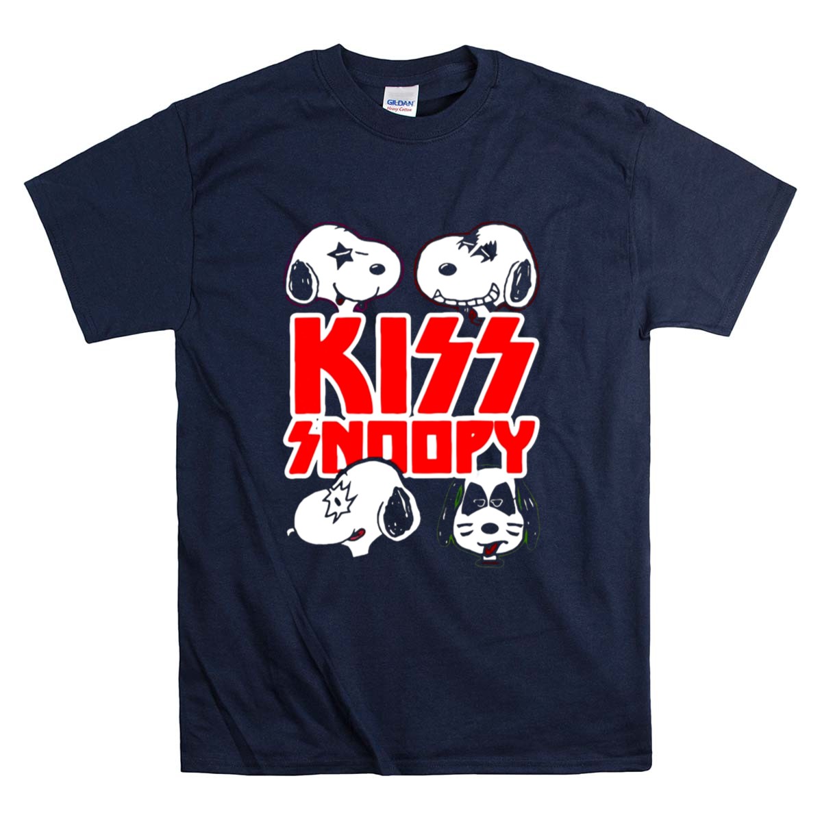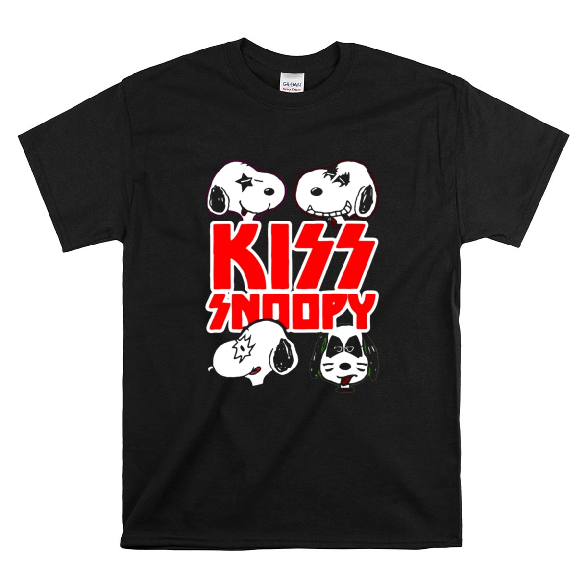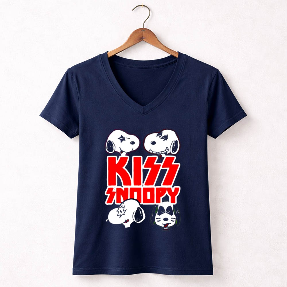 KISS band apparel, Snoopy rock mashup, Peanuts characters, fun graphic tee, nostalgic music tribute, unique gift for fans, playful cartoon design, iconic rock legends