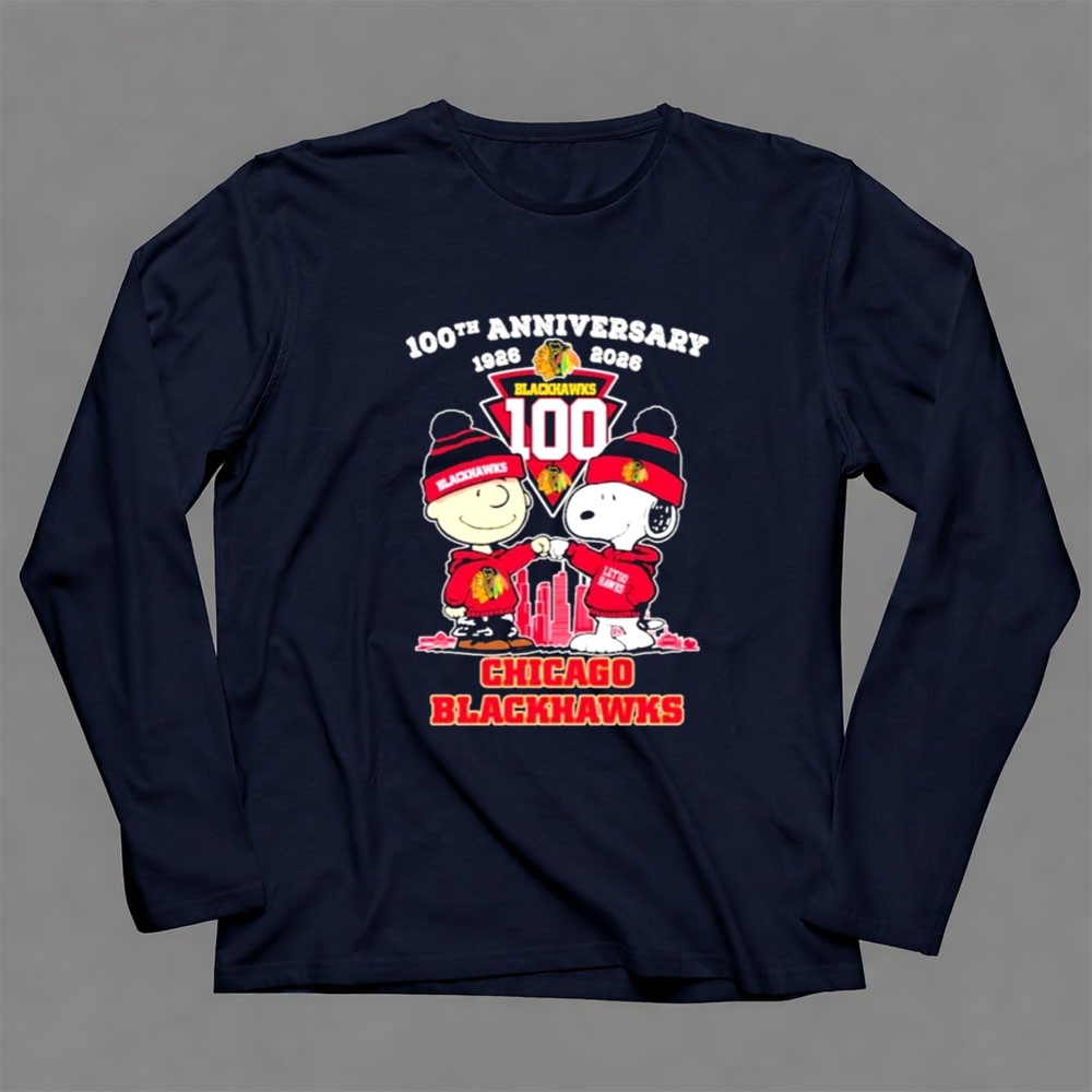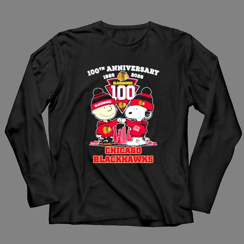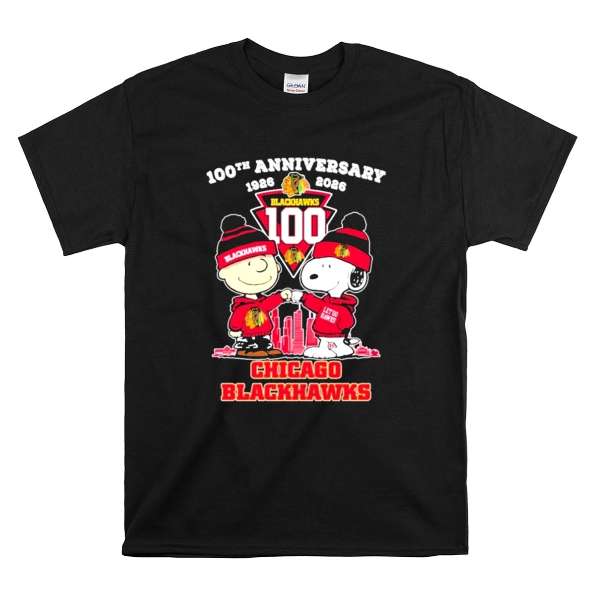 Chicago Blackhawks 100th anniversary, Peanuts characters in sports, hockey nostalgia, united by hockey, iconic team spirit, fandom celebration, game day apparel, premium graphic tee