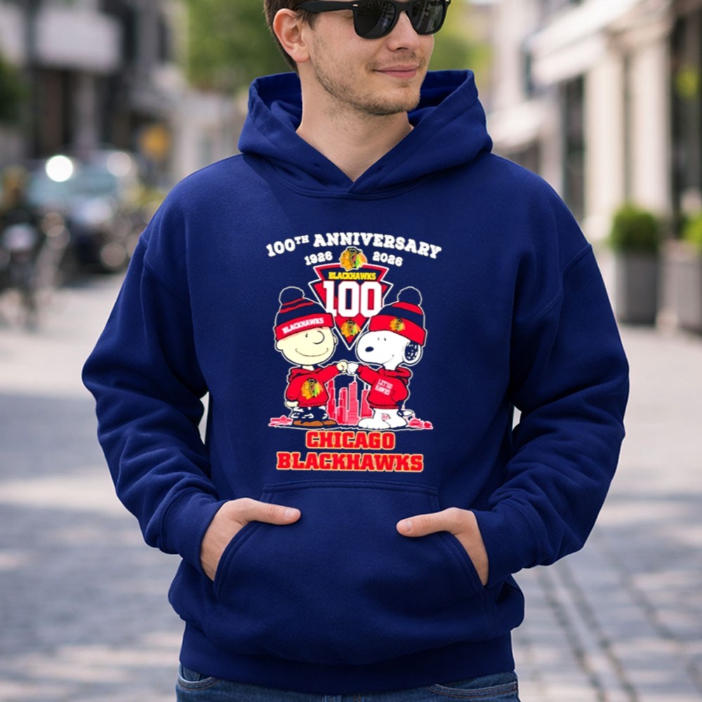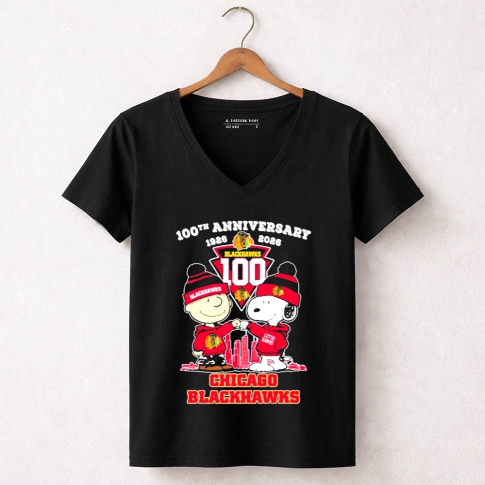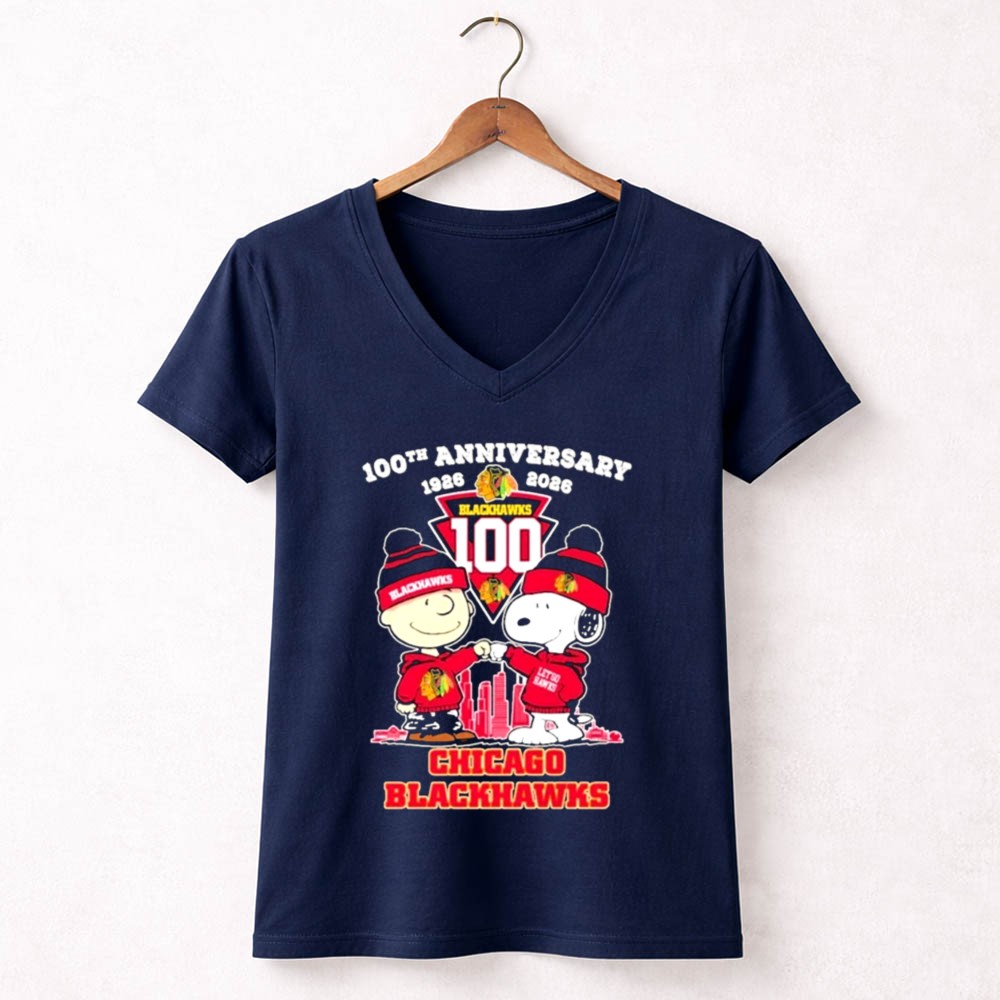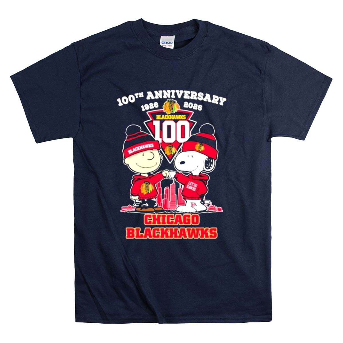 Chicago Blackhawks 100th anniversary, Peanuts characters in sports, hockey nostalgia, united by hockey, iconic team spirit, fandom celebration, game day apparel, premium graphic tee