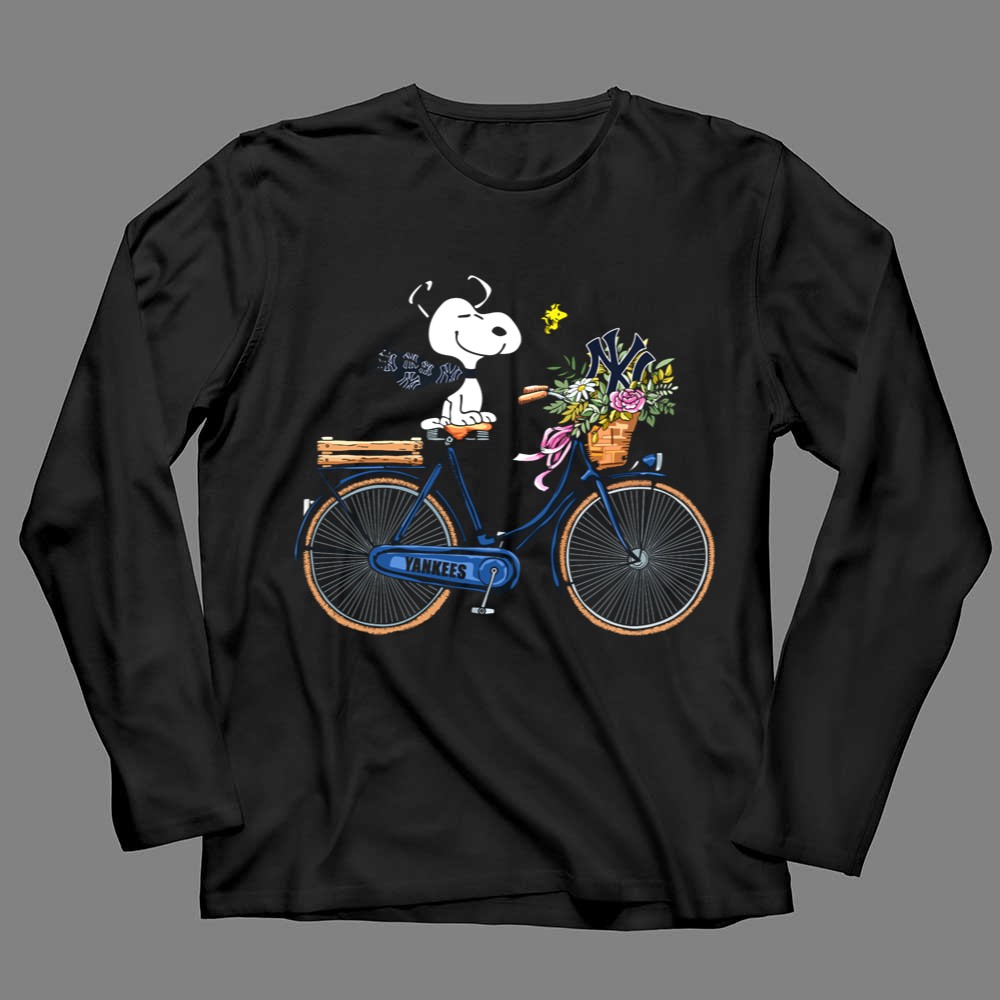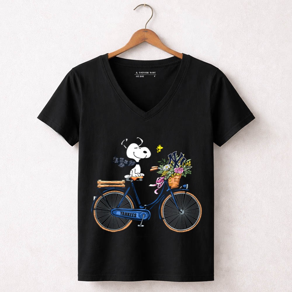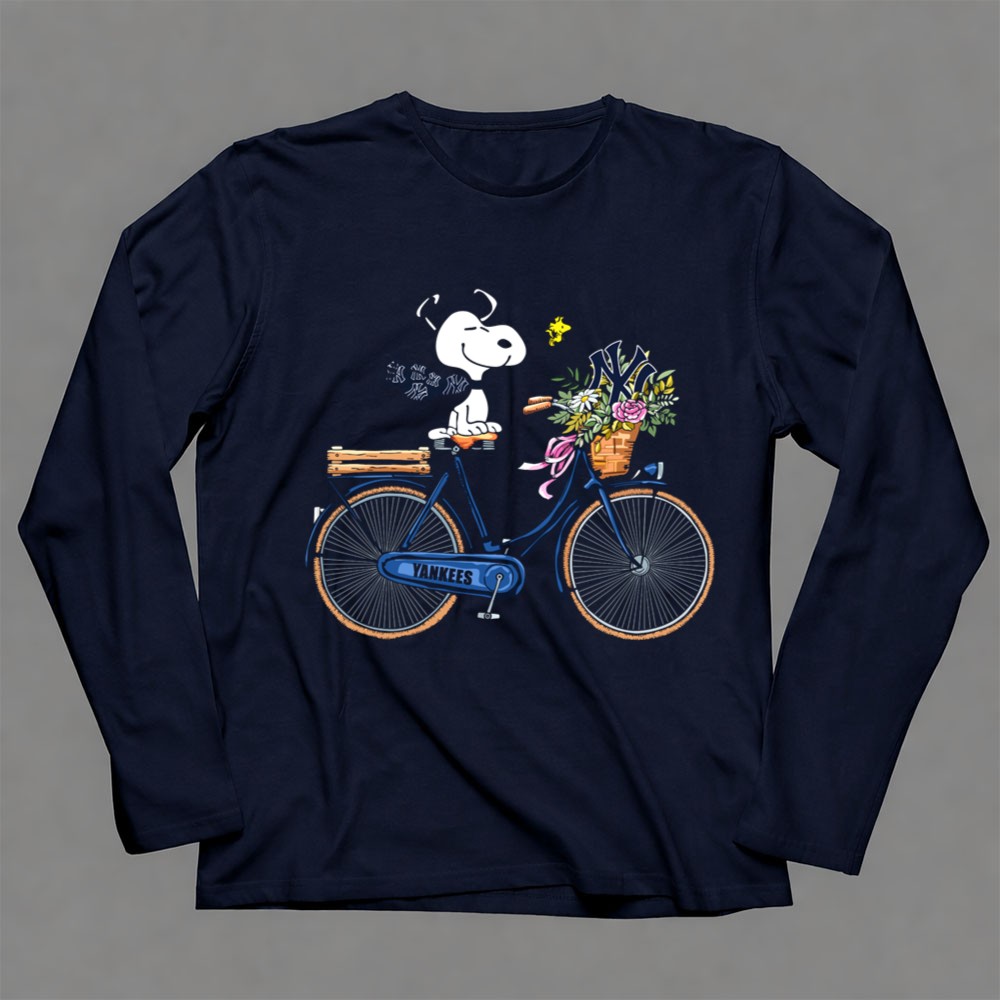 New York Yankees Snoopy On Bicycle With Woodstock And Flowers Shirt