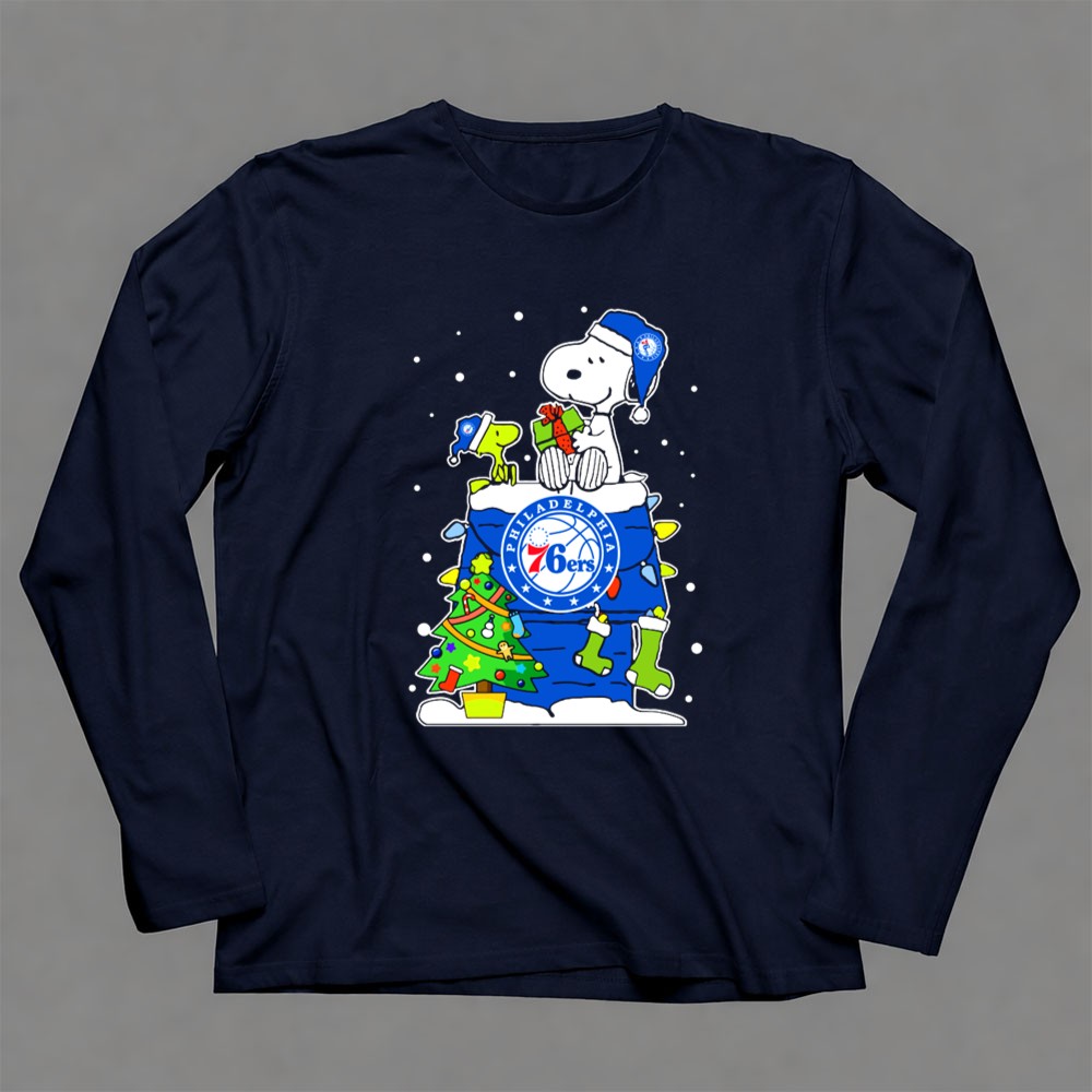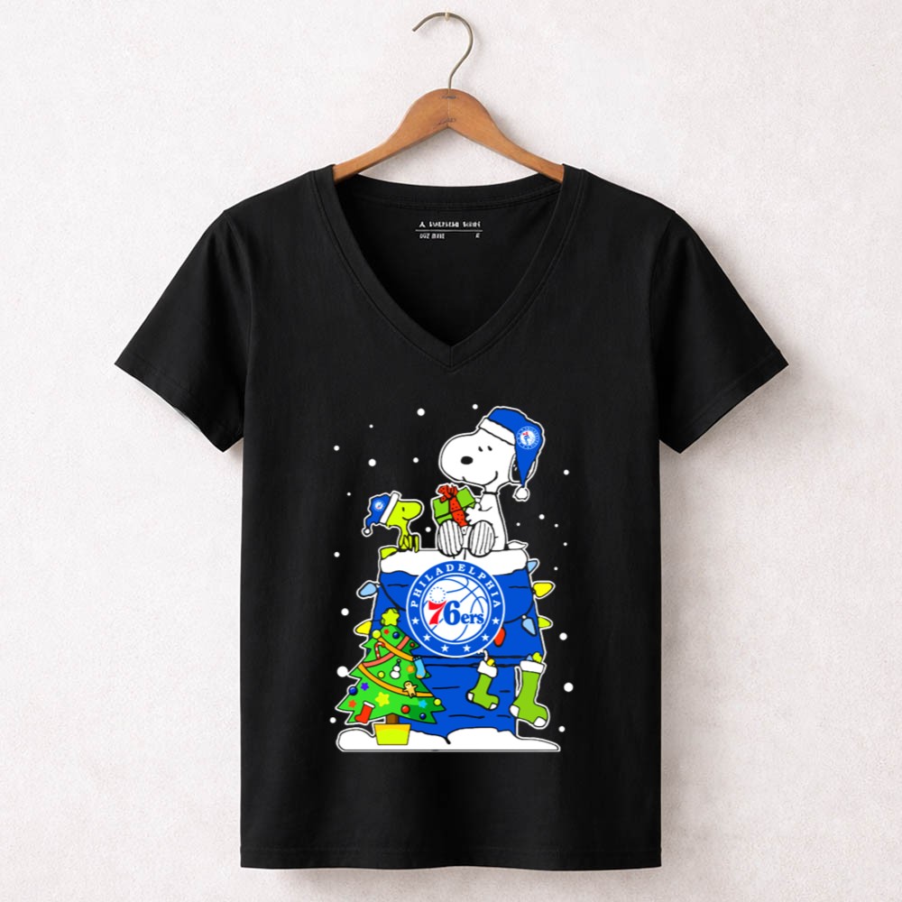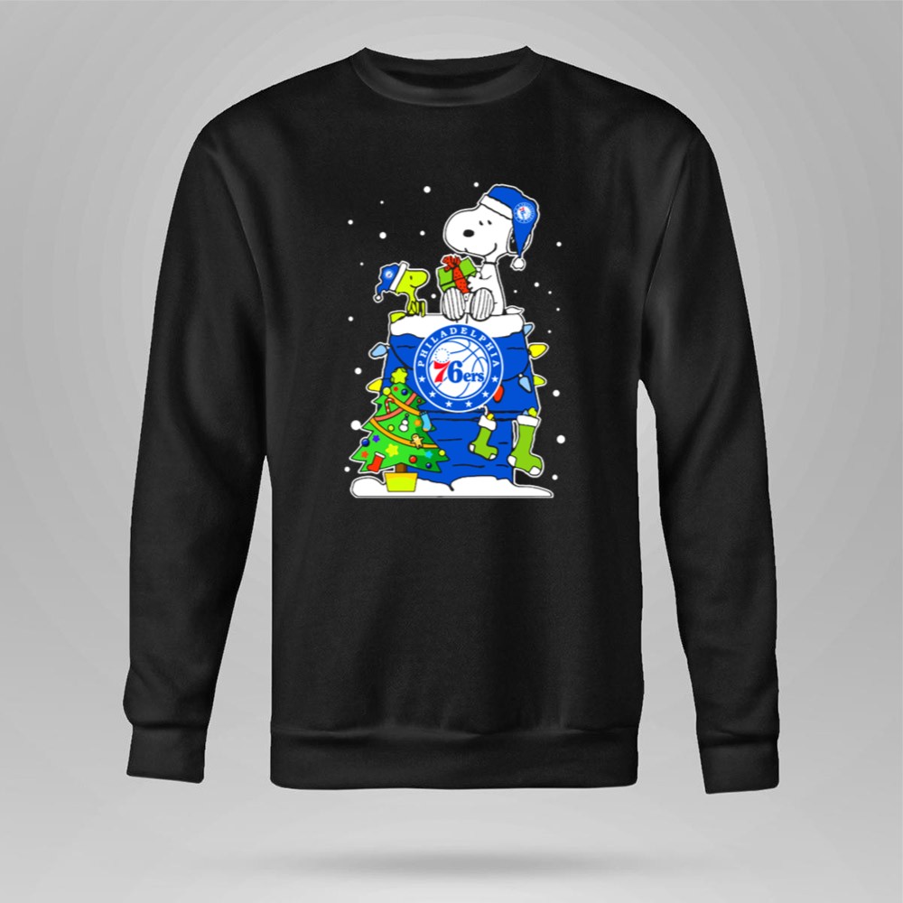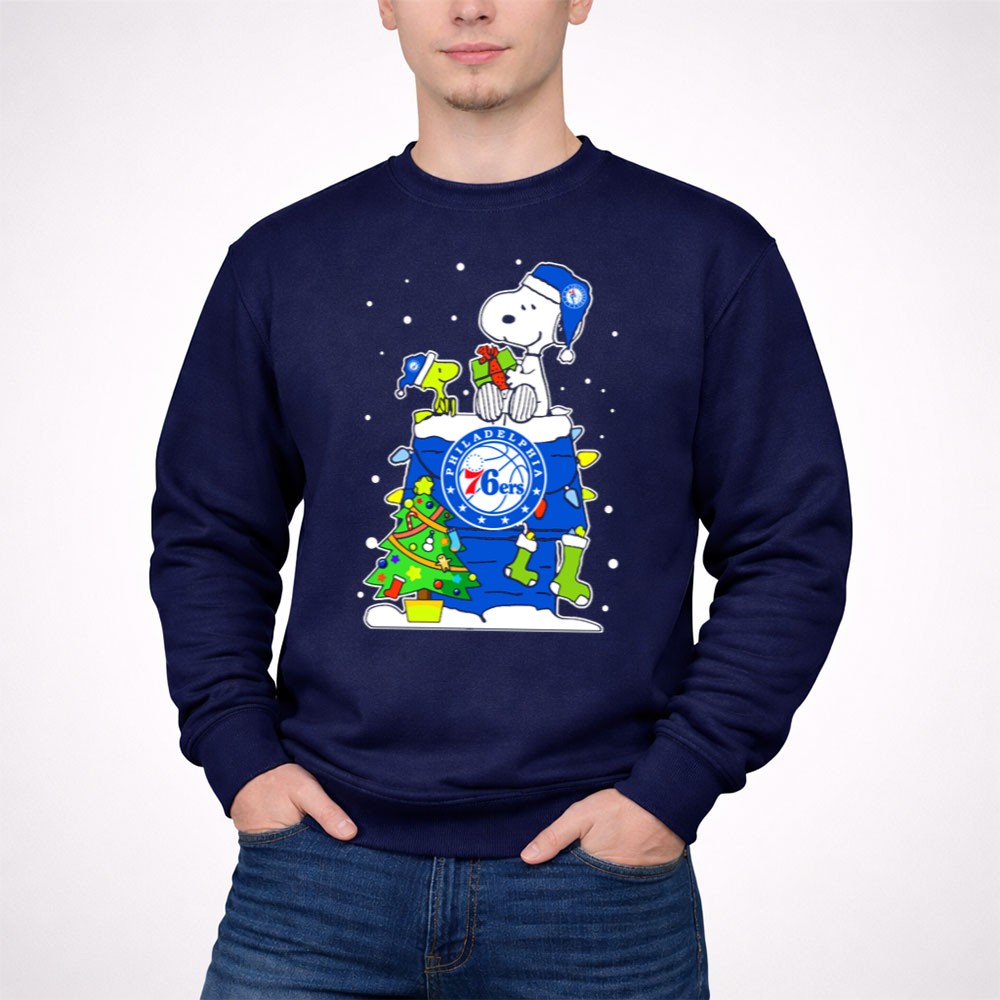 Philadelphia 76Ers Snoopy Christmas Present With Tree And Woodstock Shirt