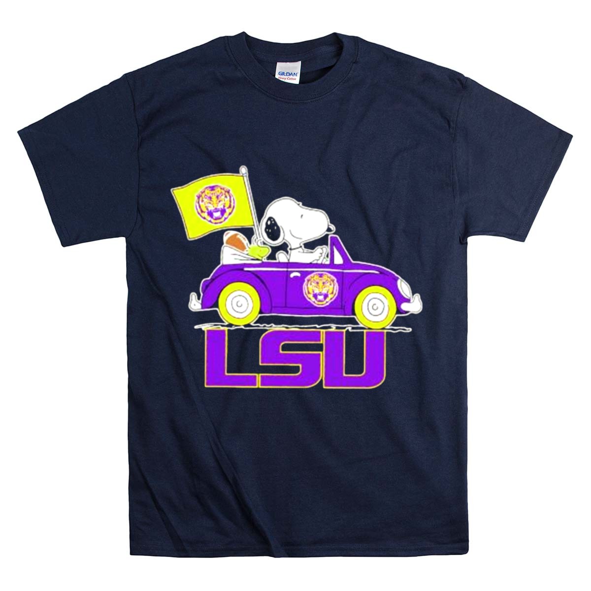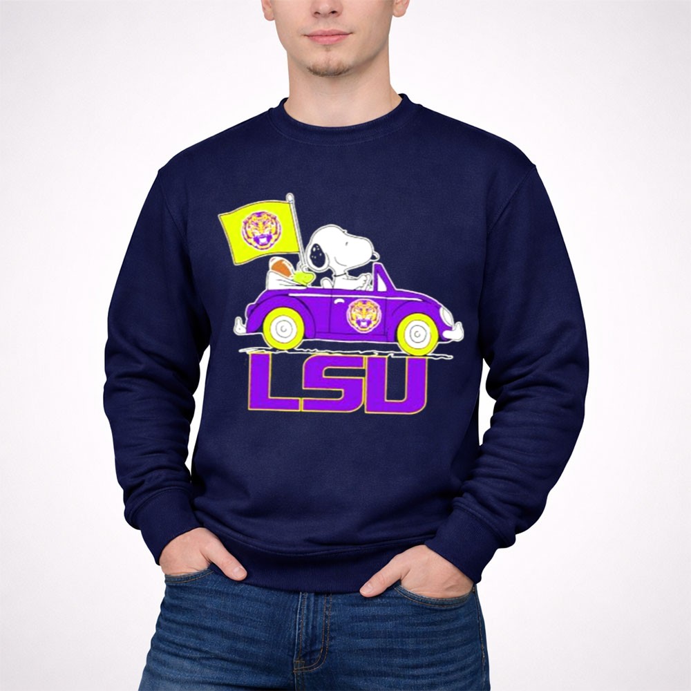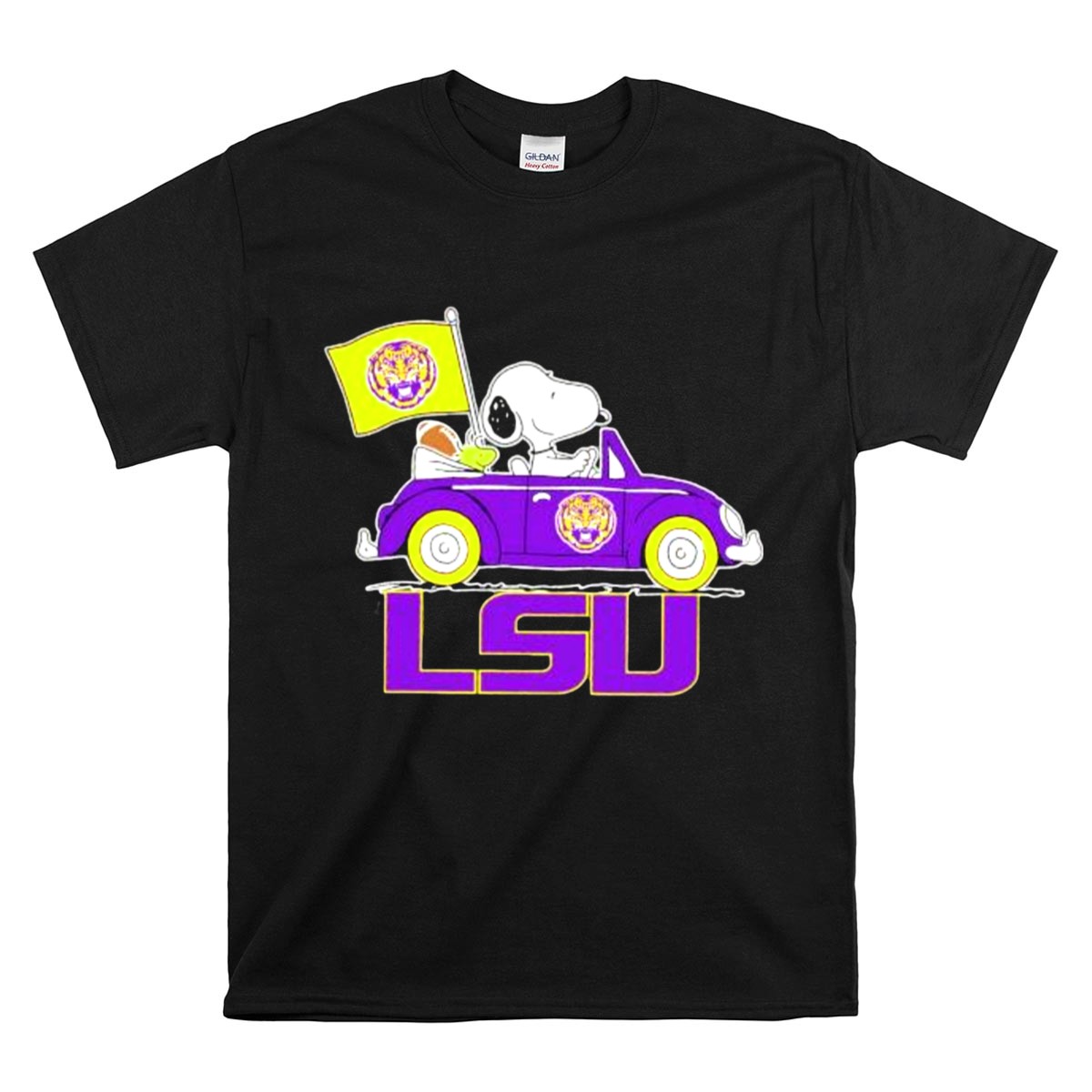 Snoopy and Woodstock Driving Purple LSU Car with Flag Shirt