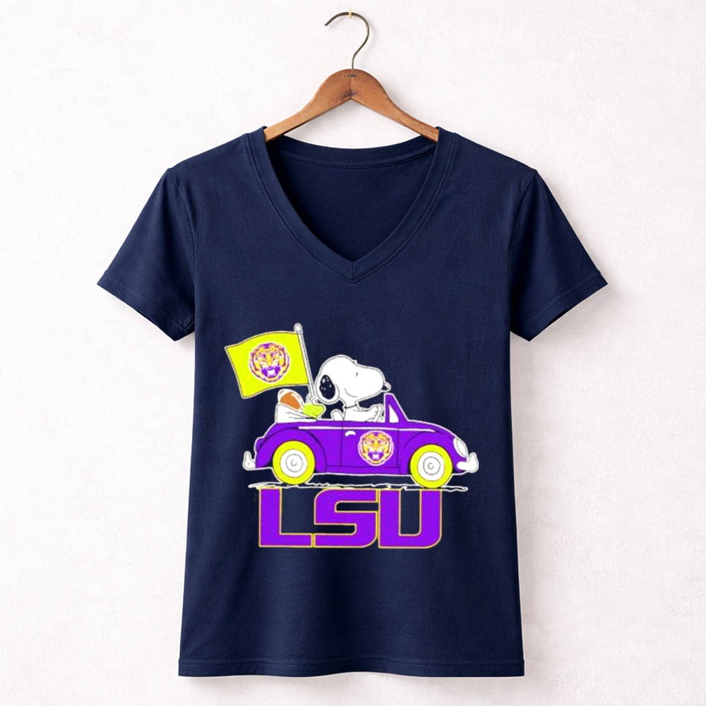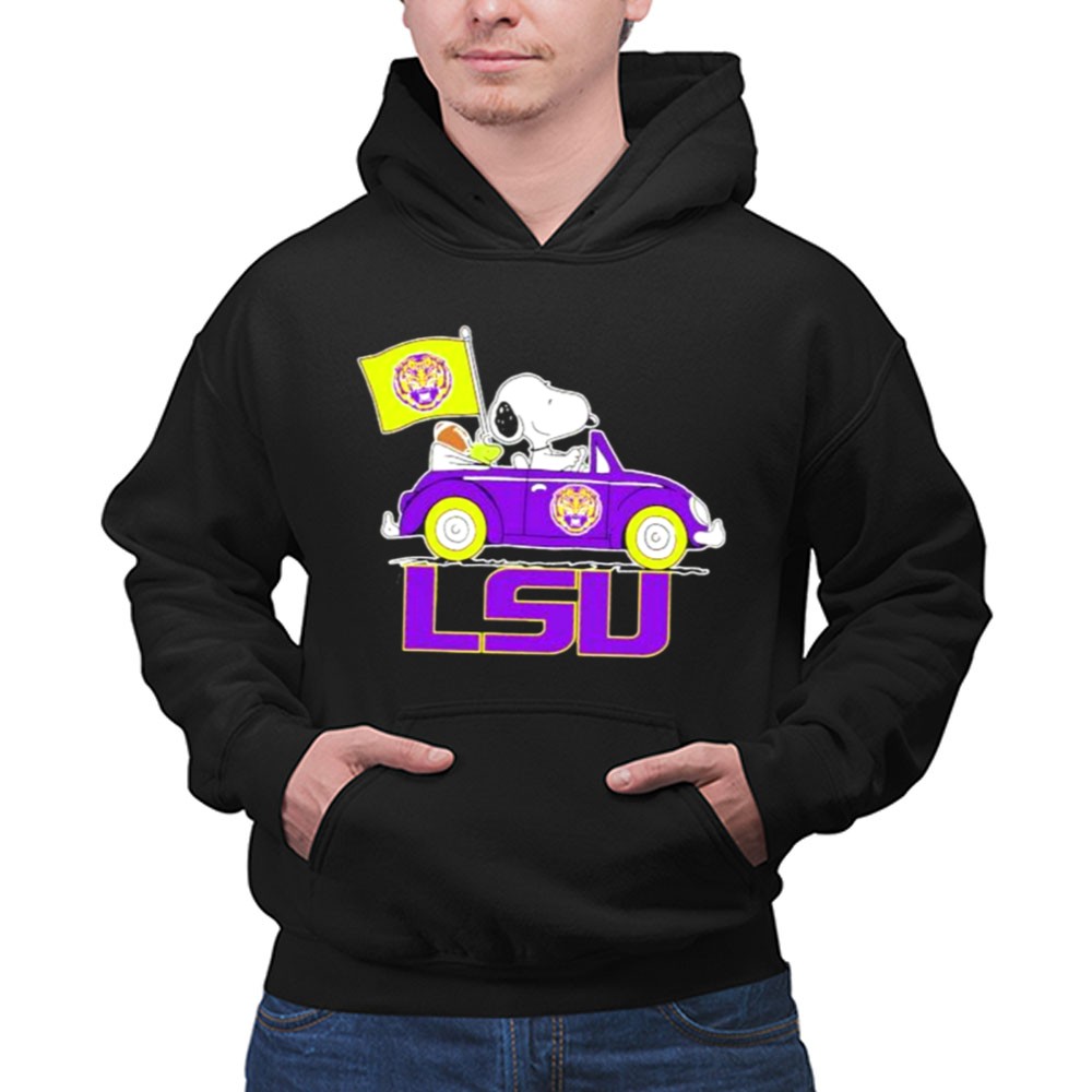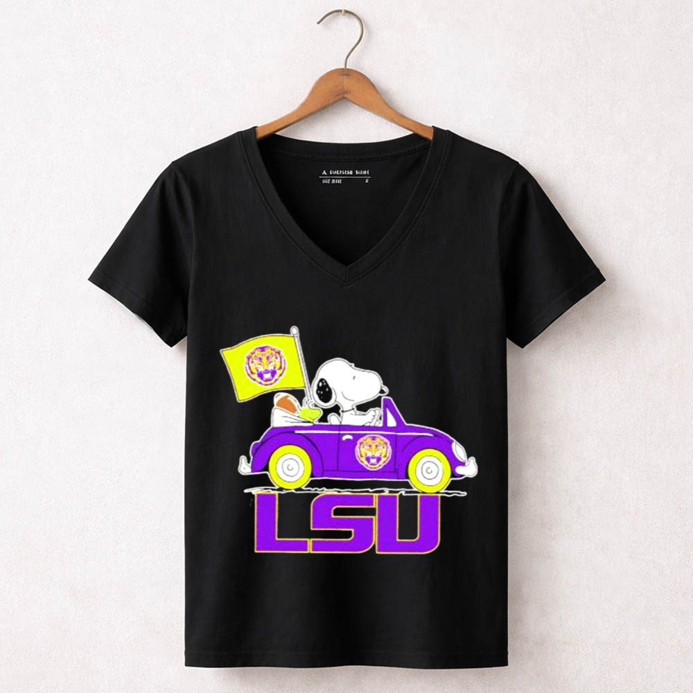 Snoopy and Woodstock Driving Purple LSU Car with Flag Shirt