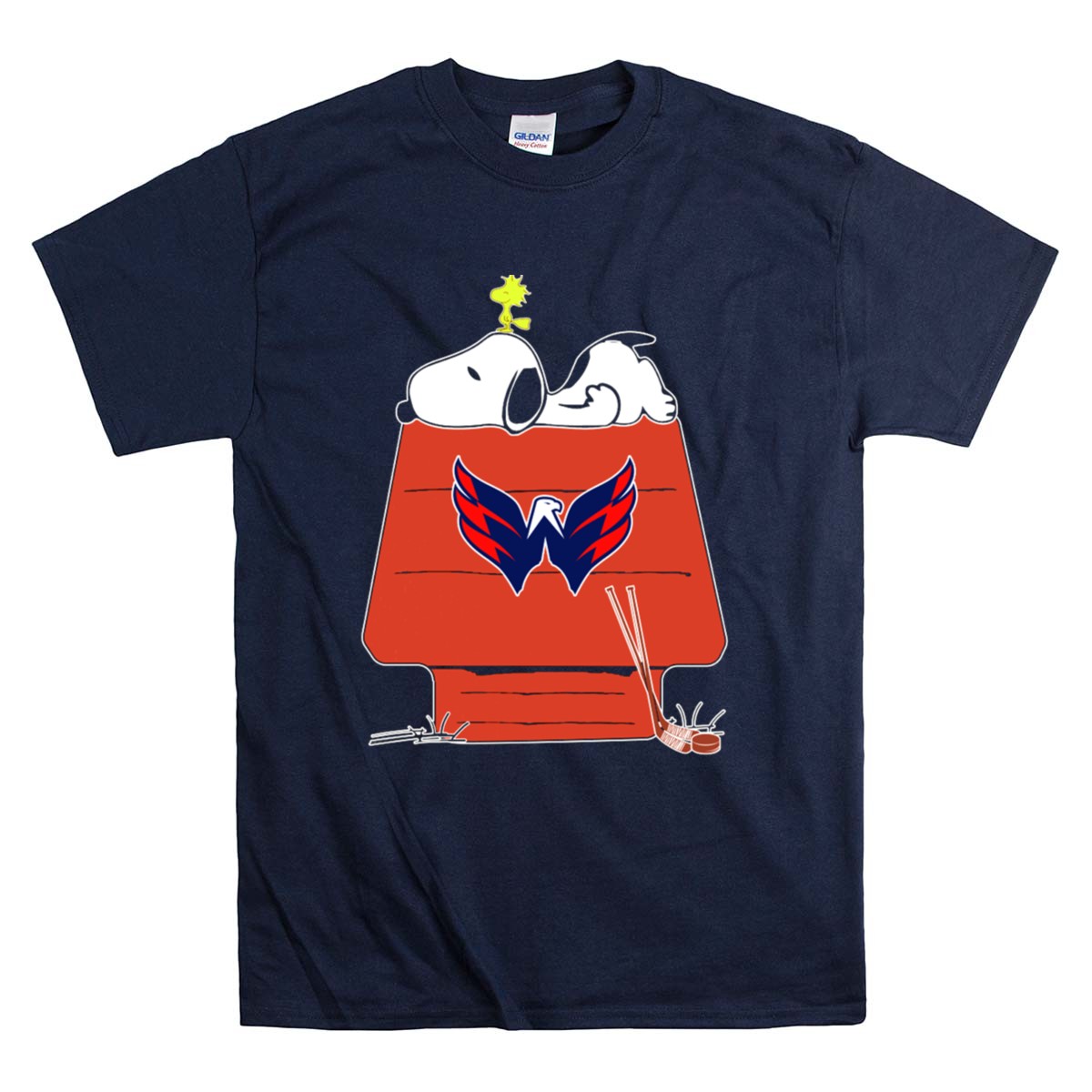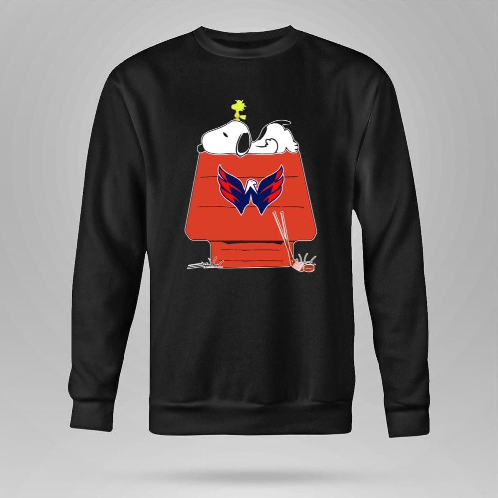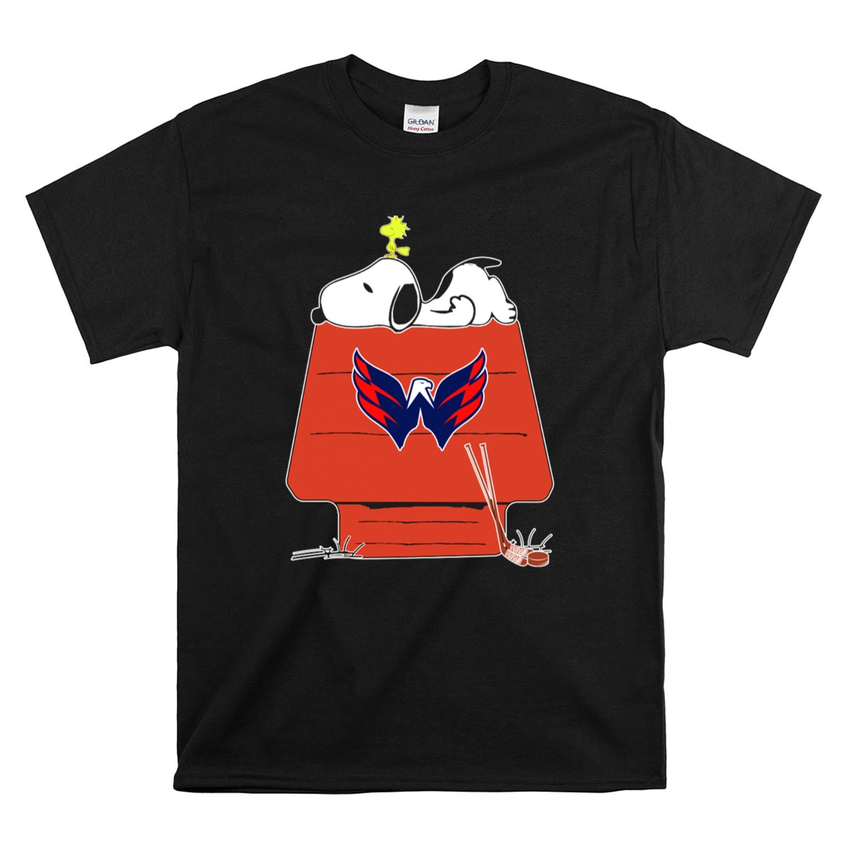 Snoopy and Woodstock with Washington Capitals Logo on Doghouse Hockey Shirt