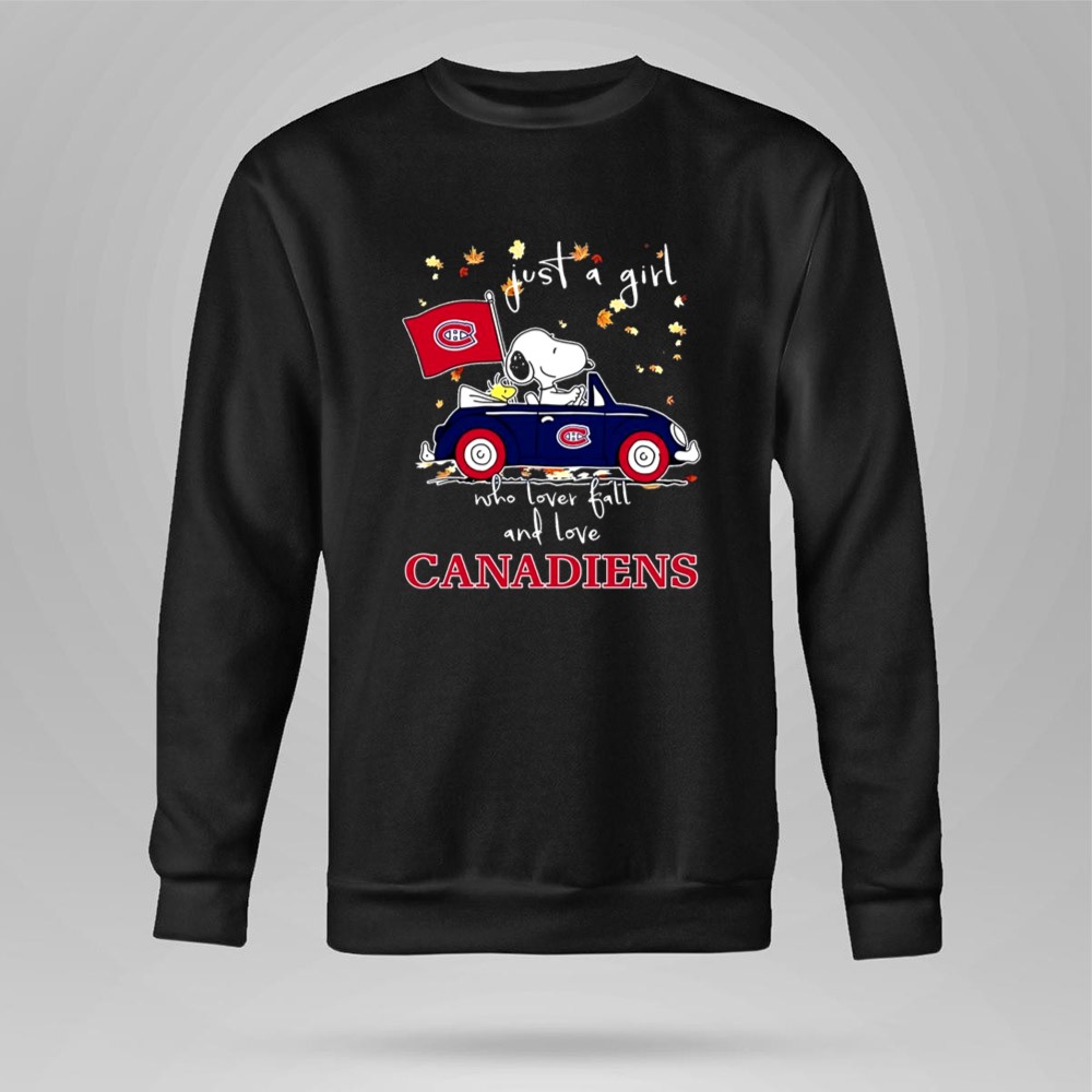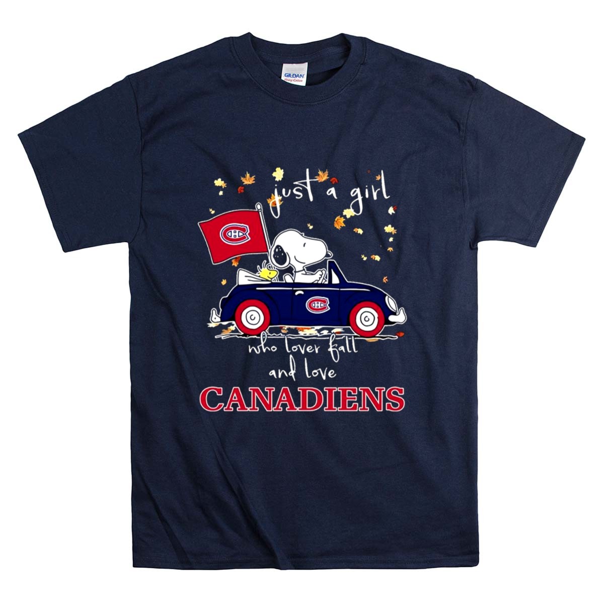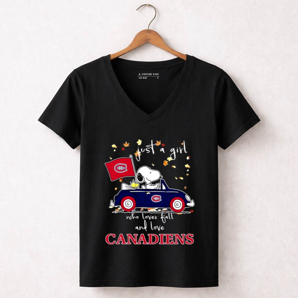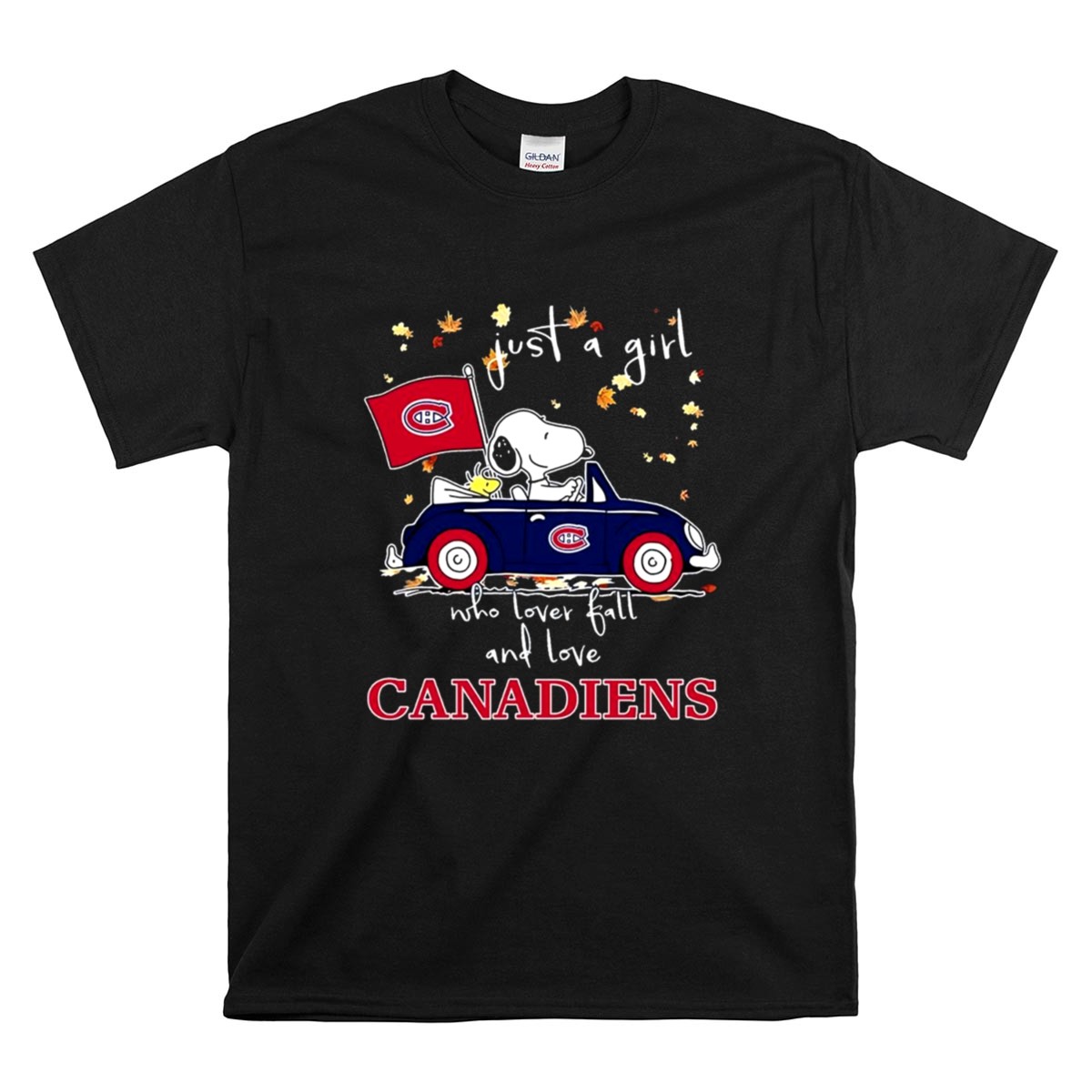 Snoopy and Woodstocks Driving Car Just A Girl Who Lover Fall And Love Montreal Canadiens Shirt