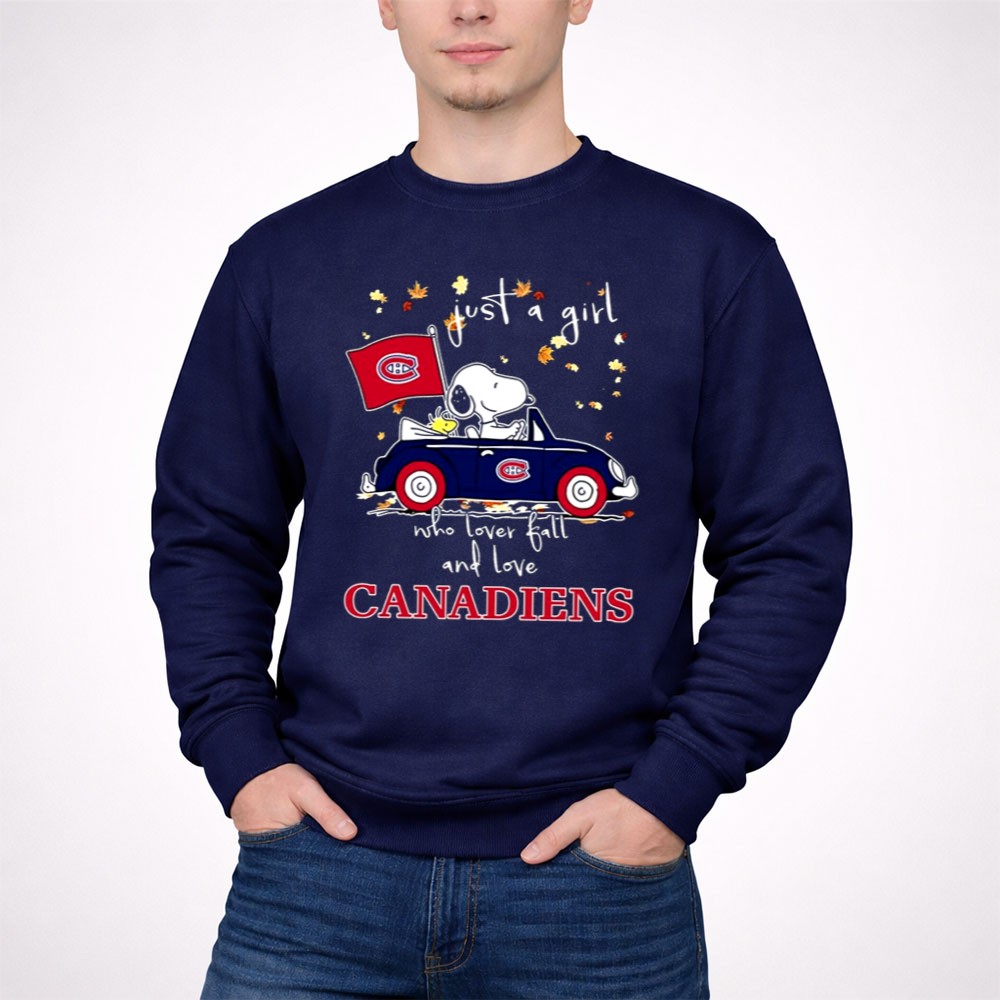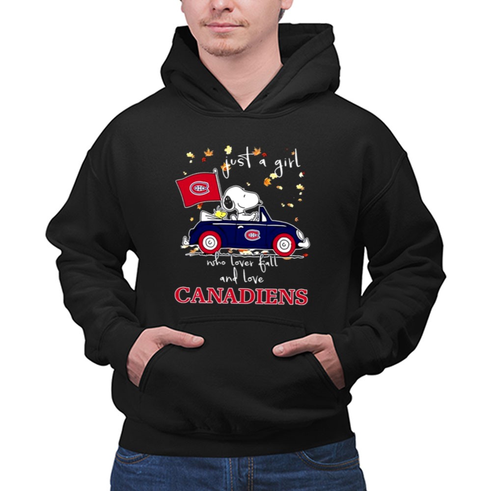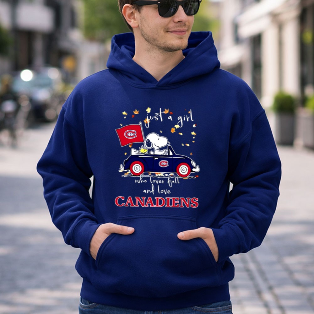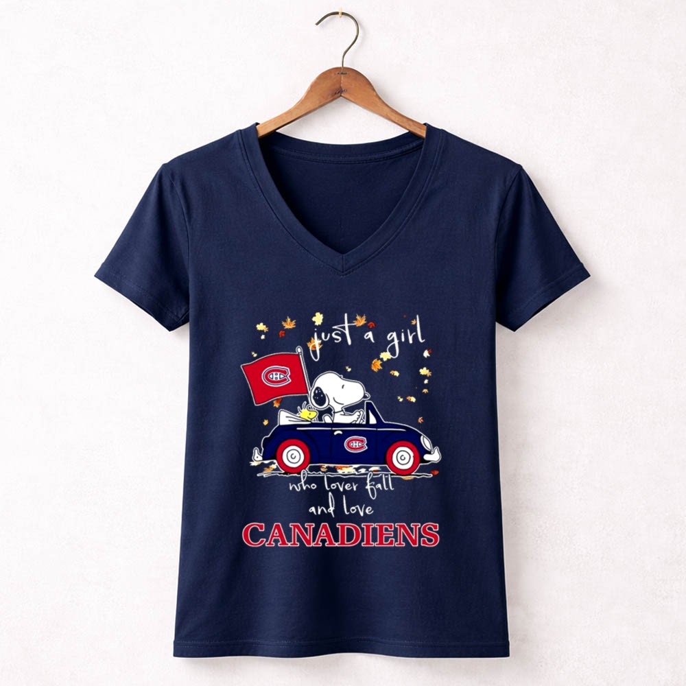 Snoopy and Woodstocks Driving Car Just A Girl Who Lover Fall And Love Montreal Canadiens Shirt