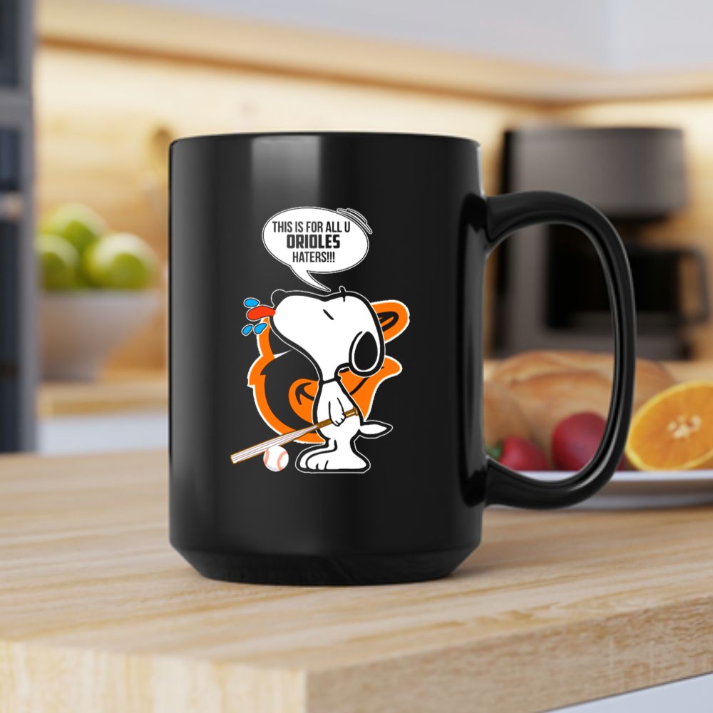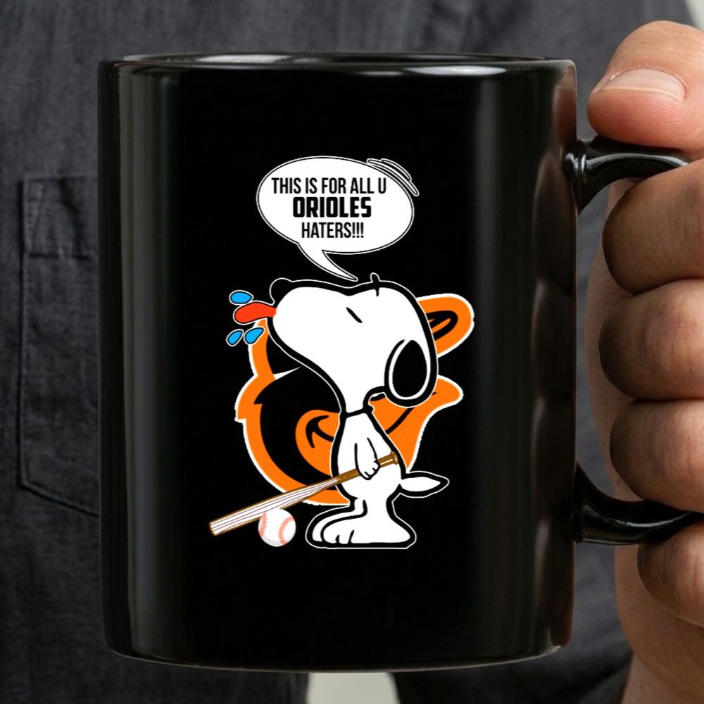 Baltimore Orioles fandom, Snoopy baseball art, Orioles haters mug, MLB coffee cup, sports humor gift, playful baseball fan gear, cartoon sports memorabilia, rivalry spirit