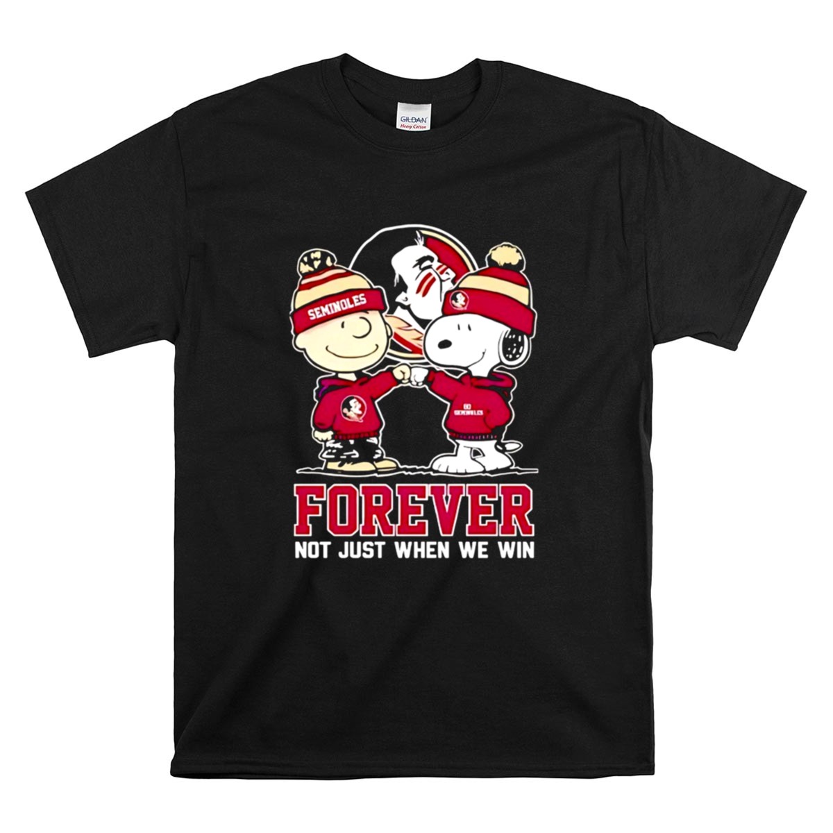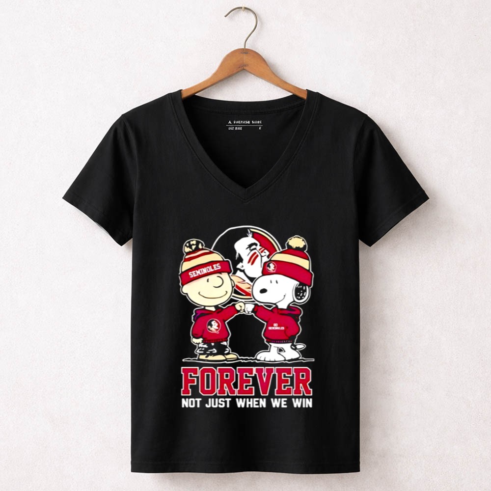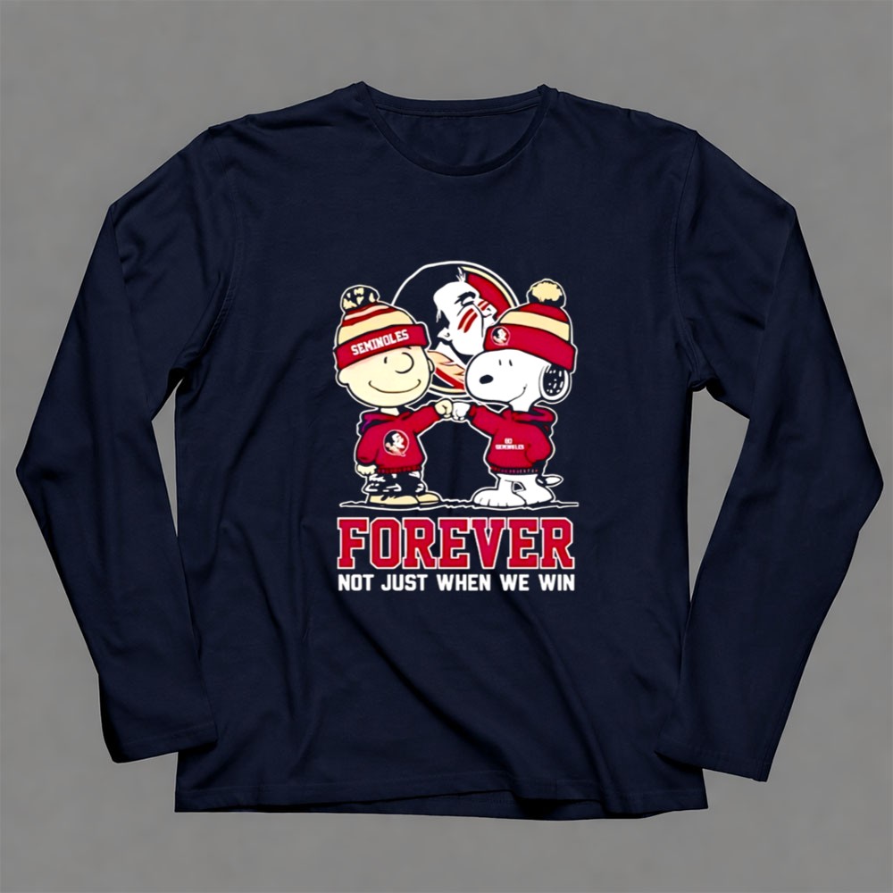 This design captures the essence of unwavering loyalty to the Florida State Seminoles, featuring the beloved characters Snoopy and Charlie Brown in vibrant fan gear. The phrase ‘FOREVER NOT JUST WHEN WE WIN’ echoes the heart of true fandom, celebrating the commitment and joy of supporting your team through every season. It’s a playful tribute that resonates with the spirit of college football tradition.