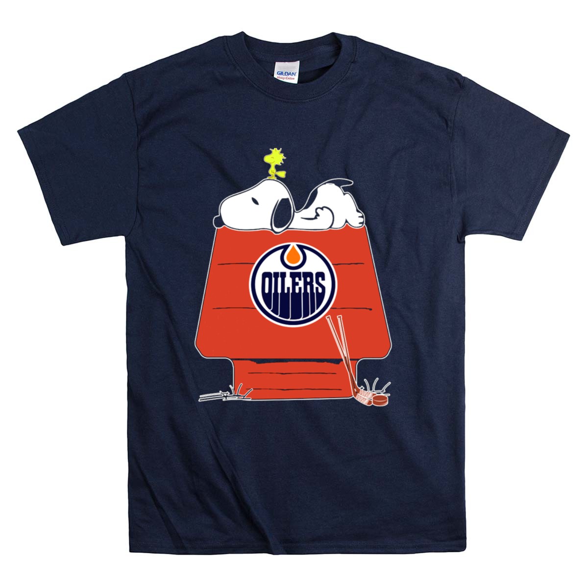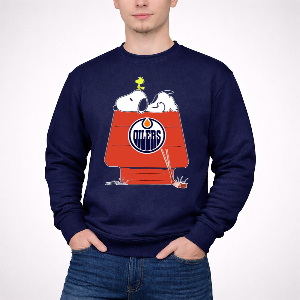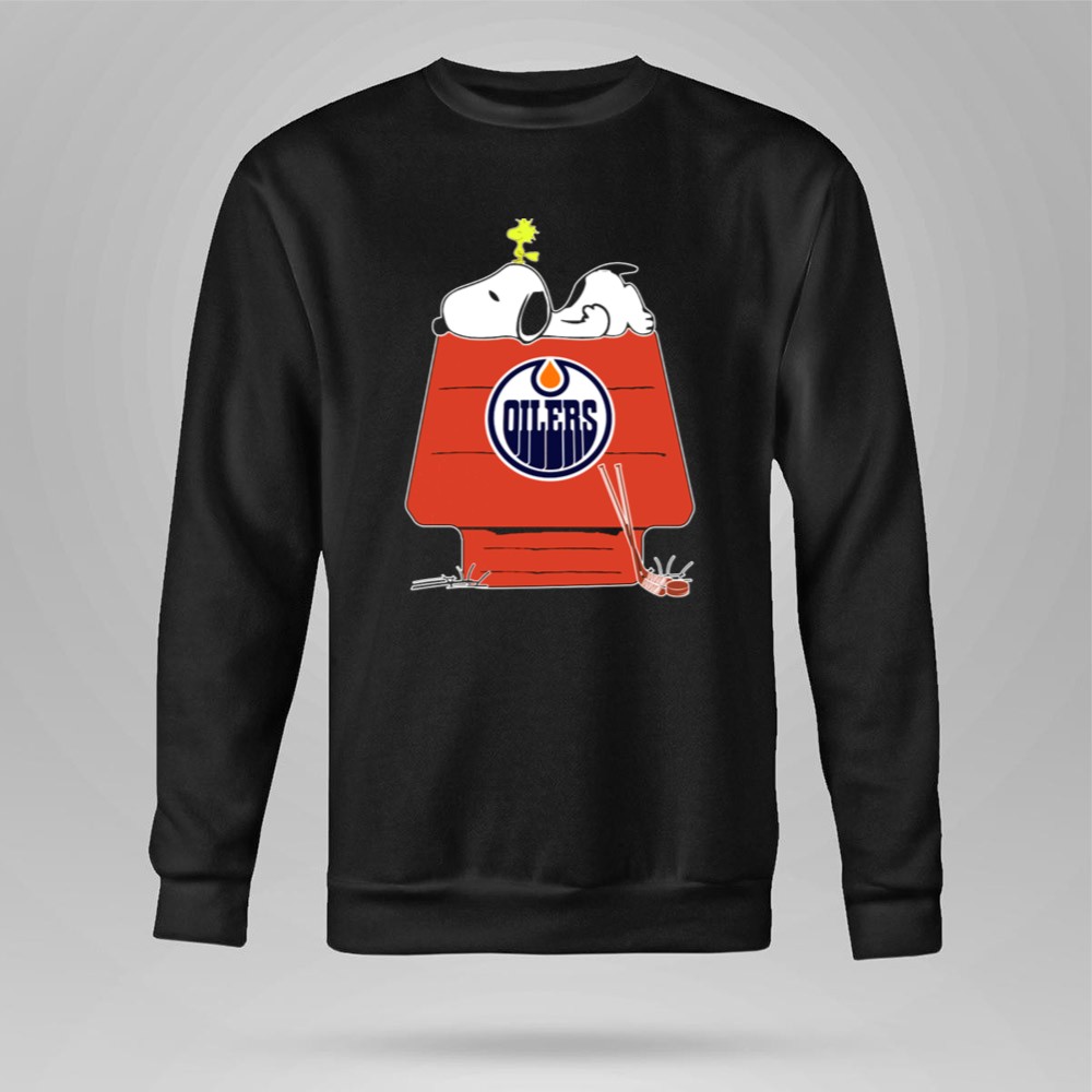 Snoopy On Doghouse With Edmonton Oilers Logo And Hockey Stick Shirt