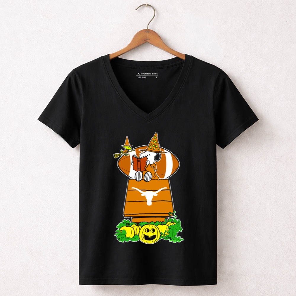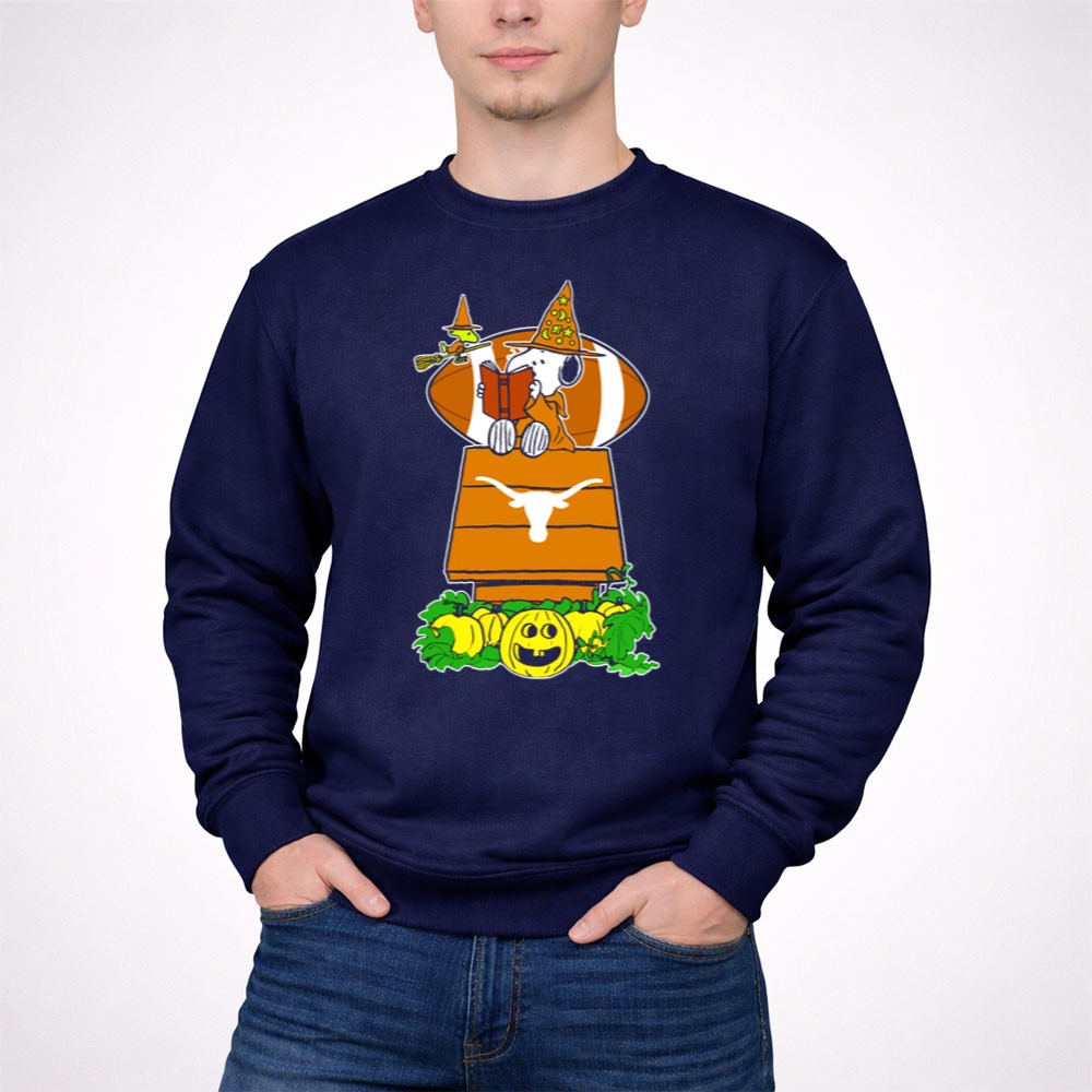 Texas Longhorns Snoopy Halloween Reading On Doghouse With Witch Woodstocks And Pumpkin Shirt