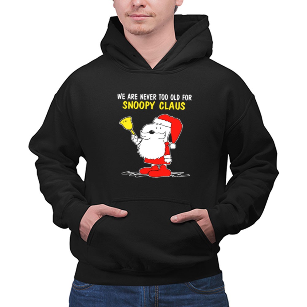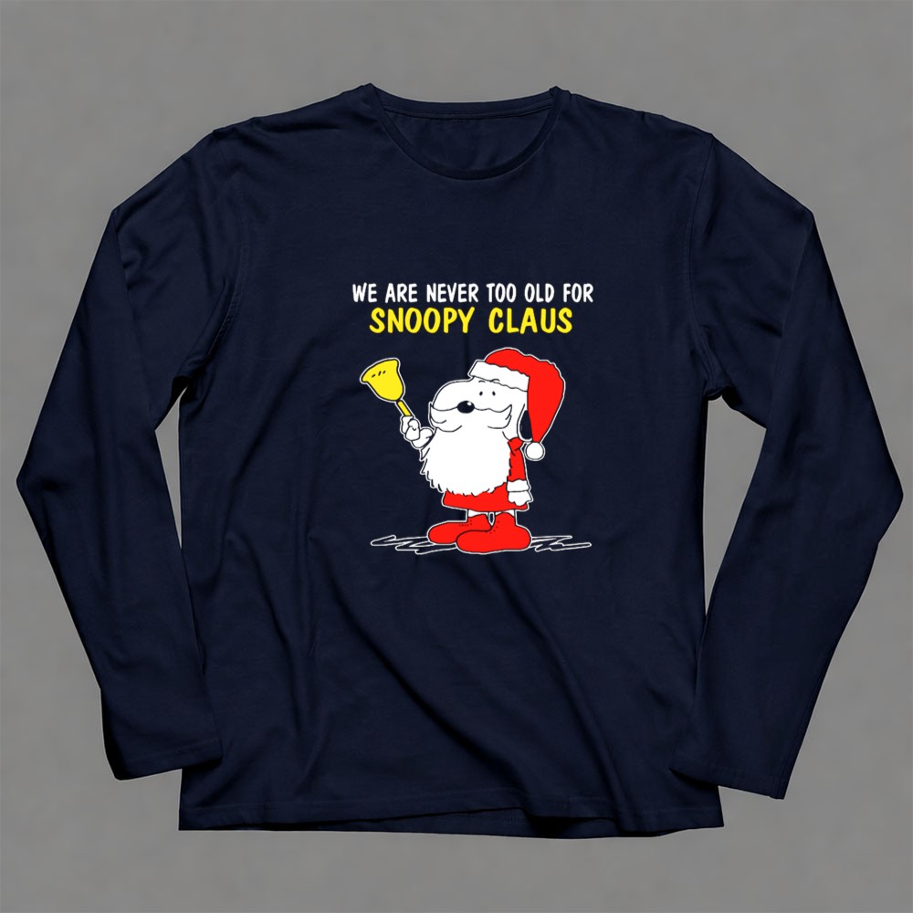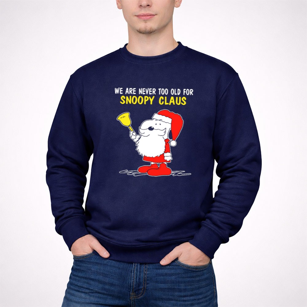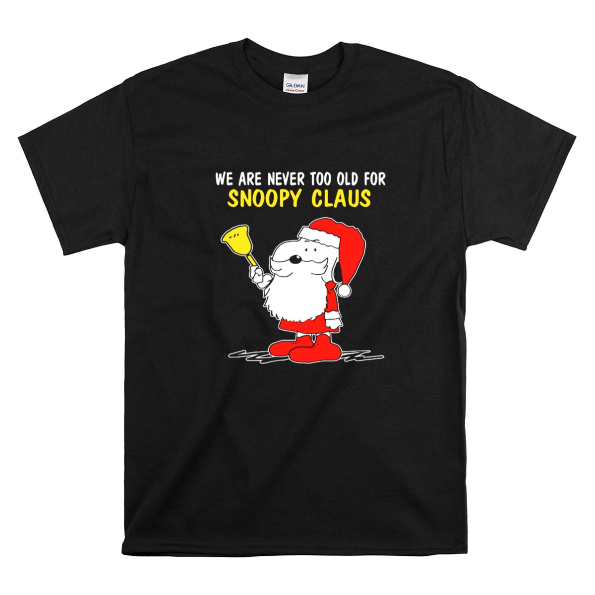 We Are Never Too Old for Snoopy in Santa Claus Outfit Holding Christmas Bell Shirt